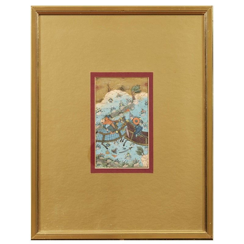 acquerelli su carta entro cornici, rappresentanti uno scontro tra due cavalieri lungo un fiume e una scena con personaggi all'esterno di un edificio.