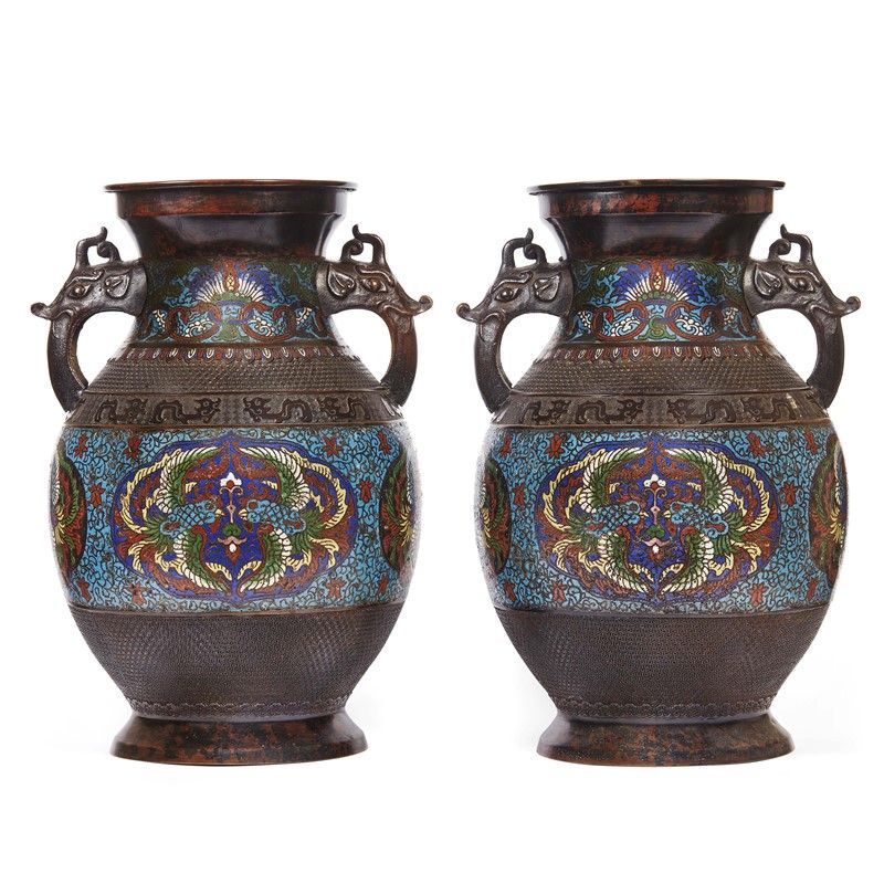 日本 十九世纪 铜胎珐琅瓶一对 高 47,5厘米