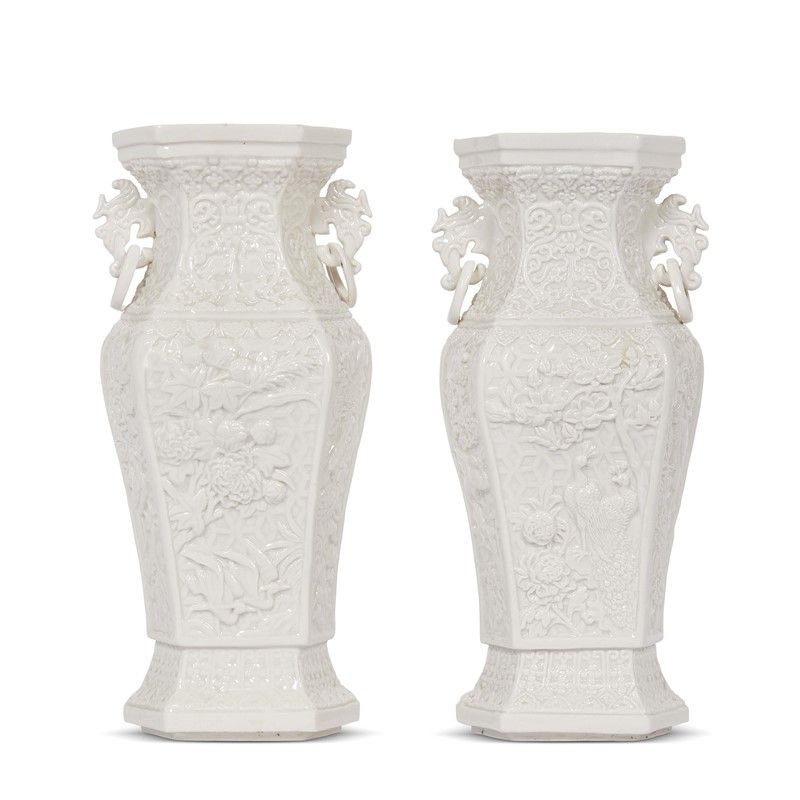 清 十九世纪 白瓷雕花卉纹活环耳瓶两件 高23,5厘米