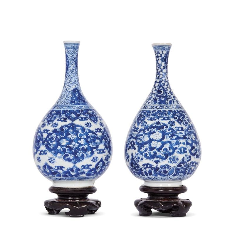 in porcellana bianco e blu a forma Yuhuchunping, decorati con fiori stilizzati. Recano come marchio una foglia.