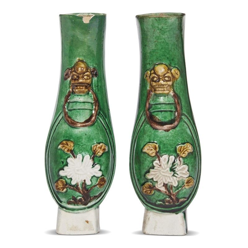 清 十八世纪 绿地素三彩花卉纹壁瓶一组两件 高16,5厘米