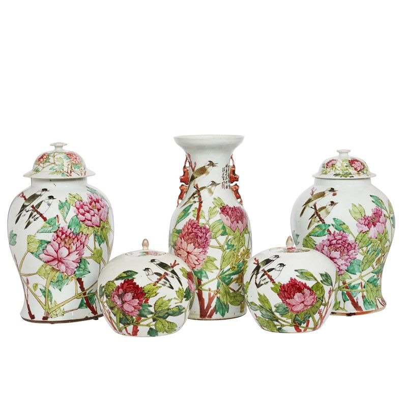 中国 二十世纪中叶 粉彩花鸟纹器一组五件 高20,5 -44厘米