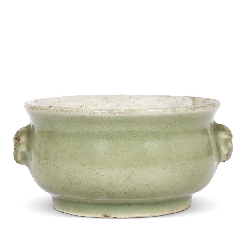 in porcellana celadon con due prese a forma di testa di leone.