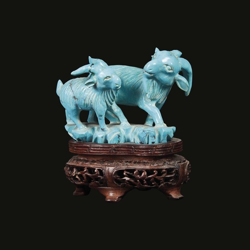 中国 二十世纪 绿松石双羊摆件 高4厘米