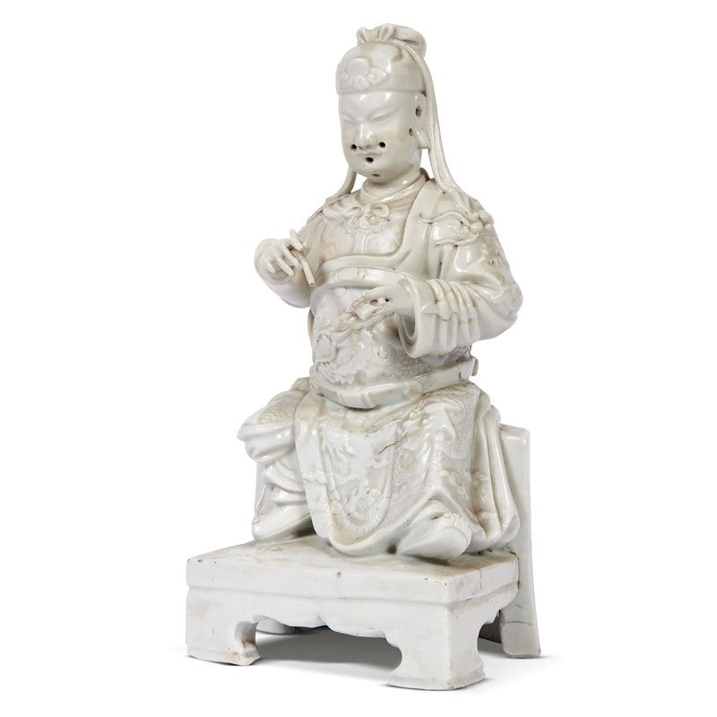in porcellana bianca Dehua raffigurante Caoguojiu seduto.