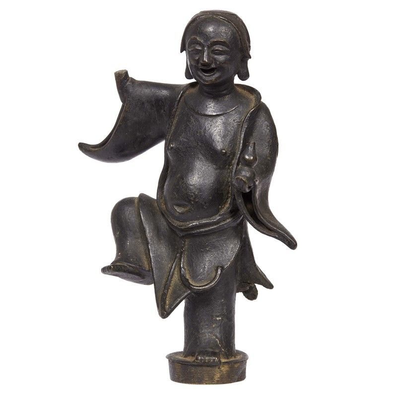 in bronzo brunito raffigurante una bodhisattva che tiene un contenitore a forma di dippia di zucca, con l'elevazione del piede sinistro, posta su una delicata base.