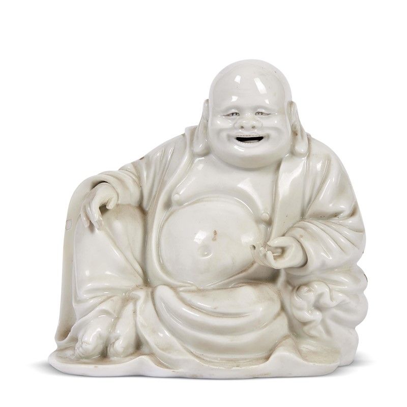in porcellana bianca Dehua raffigurante Maitreya seduto.