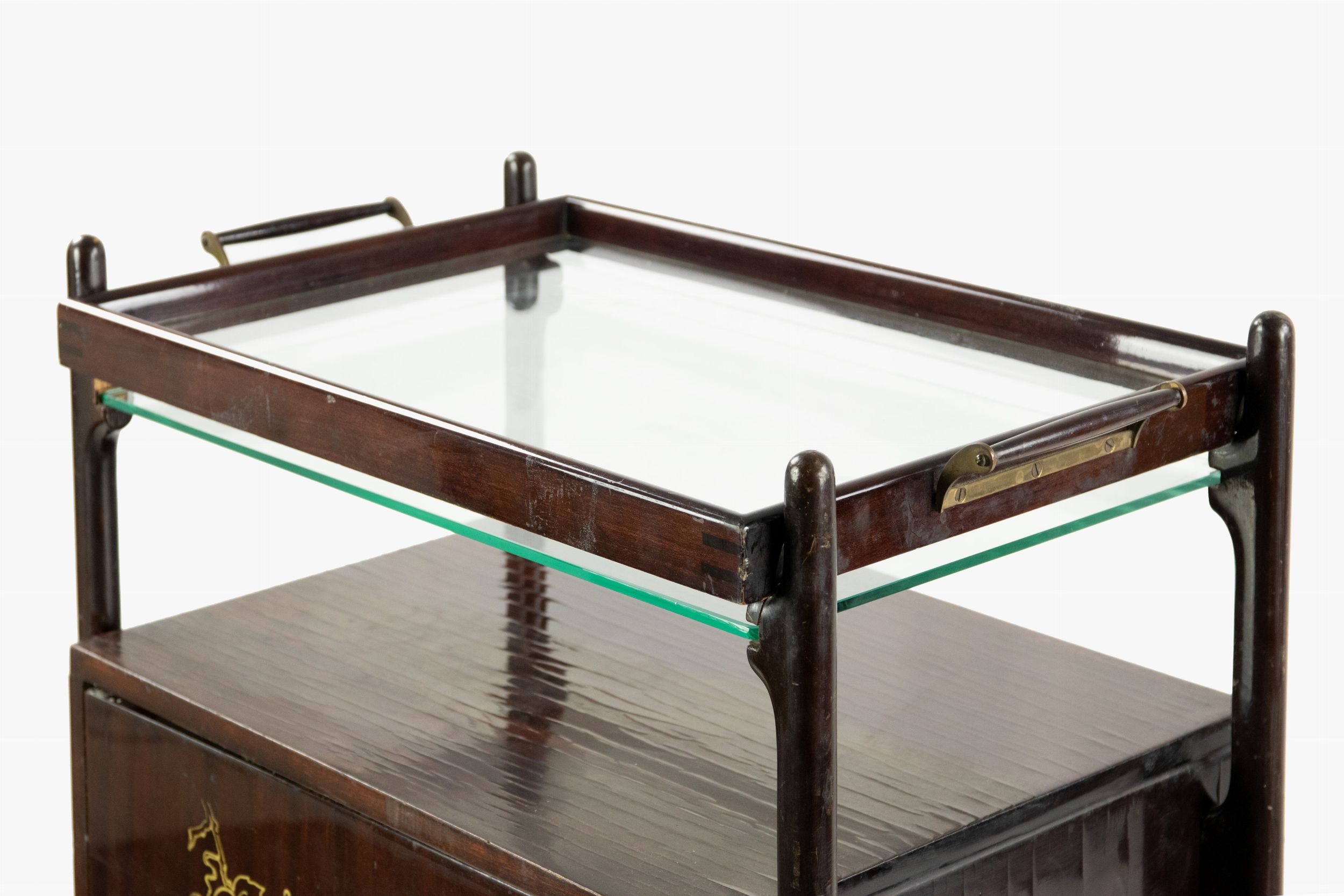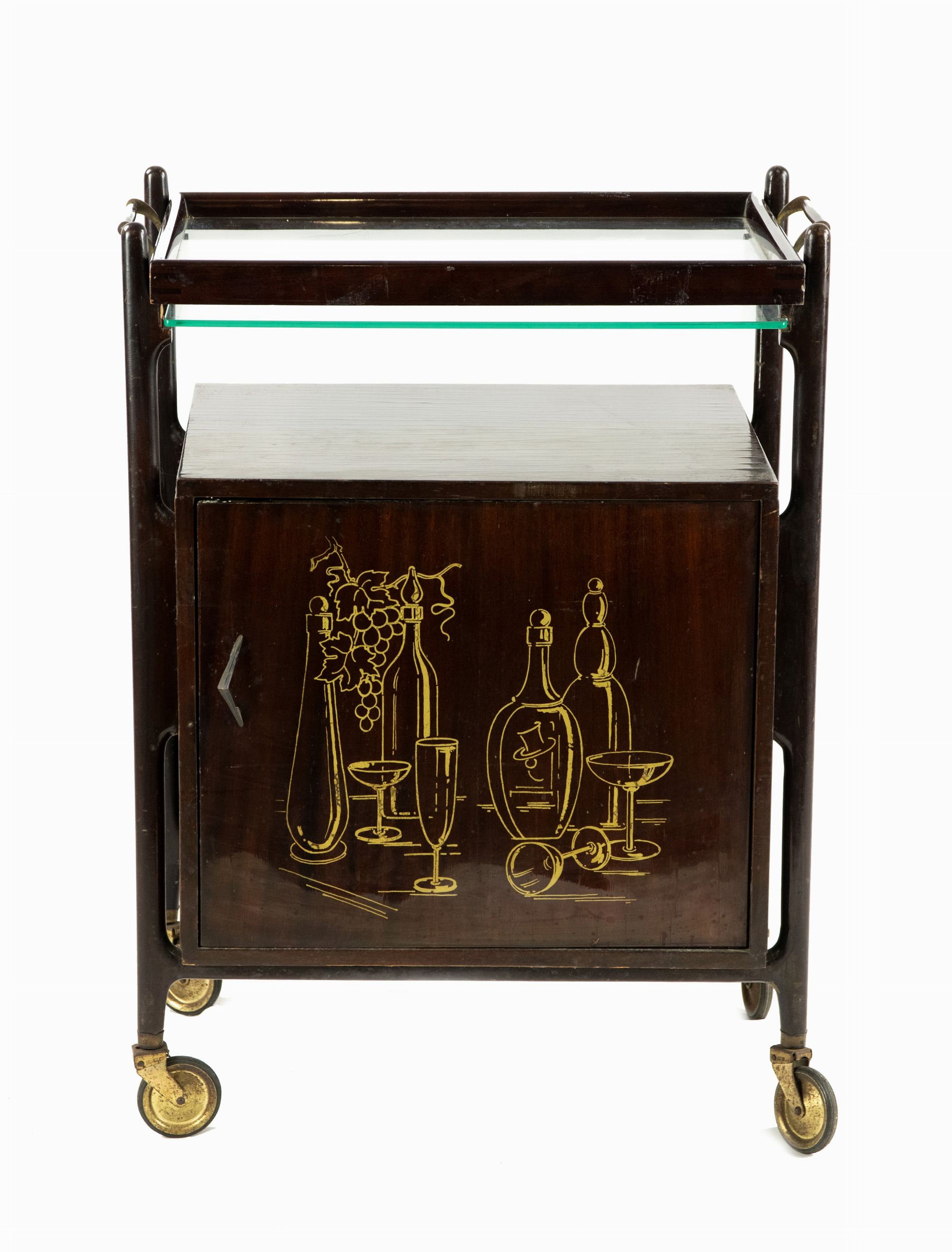 Sulla porta laterale decorazione stampata. All'interno dell'anta sono presenti dei ripiani per riporre le bevande.