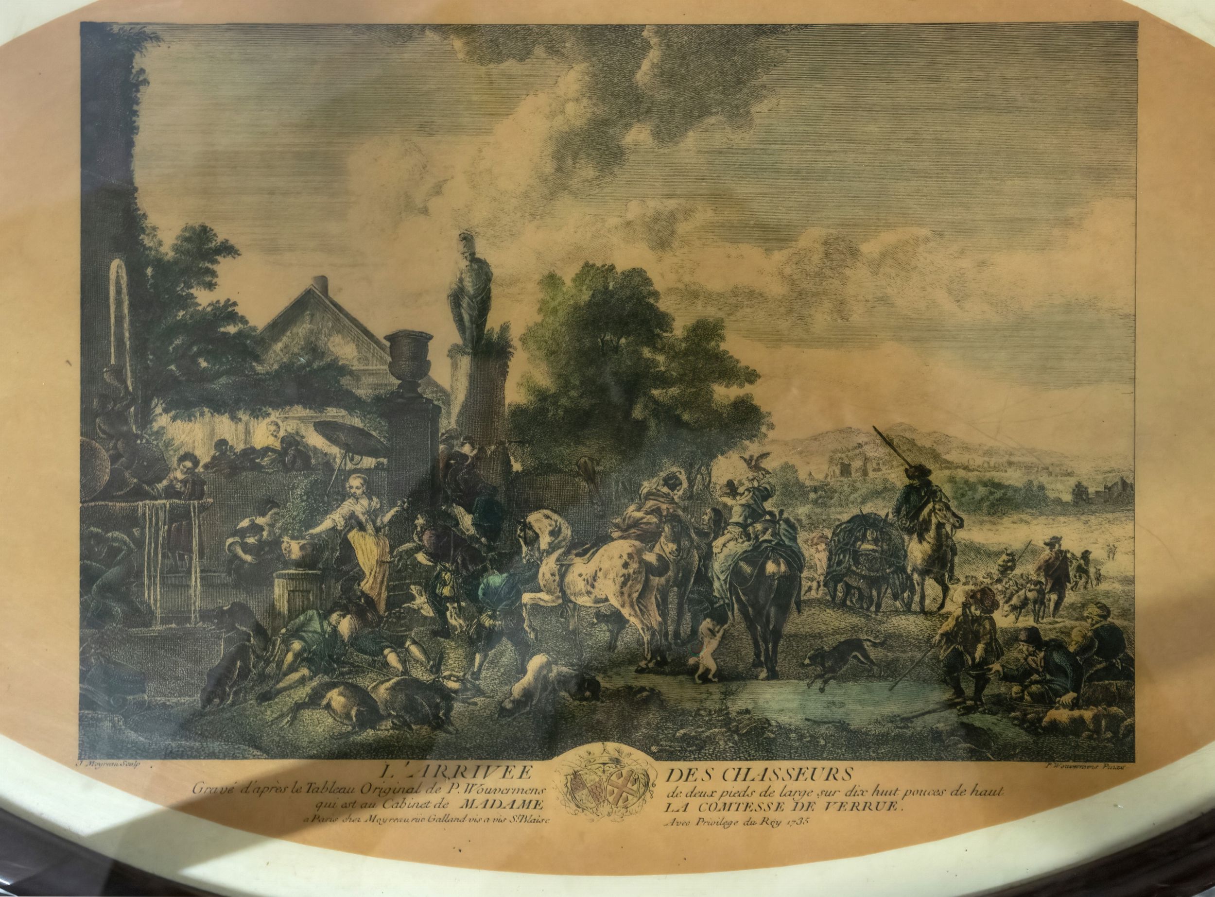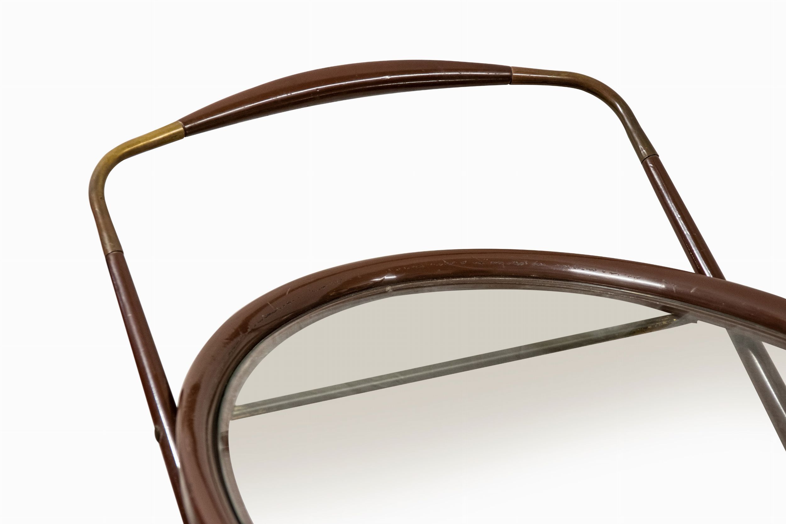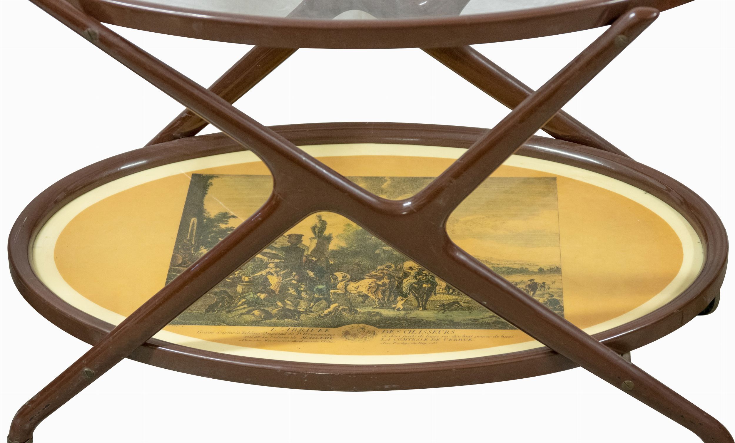 Metà del XX Secolo Carrello bar in legno e ottone con ripiani in vetro. Sulla base in vetro è presente una litografia.