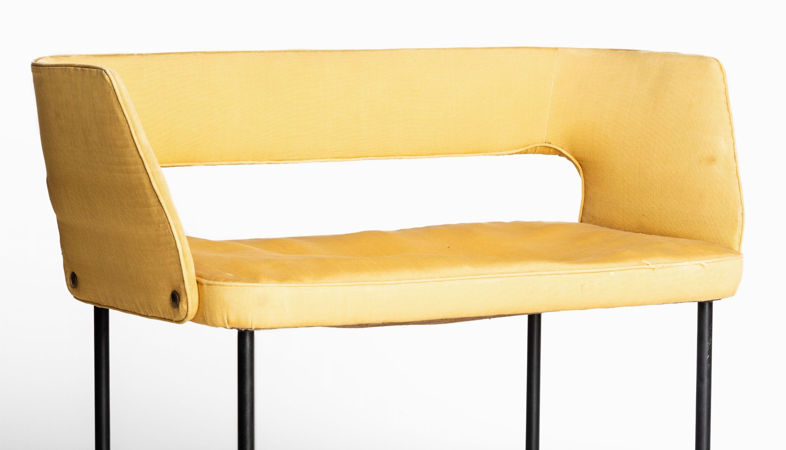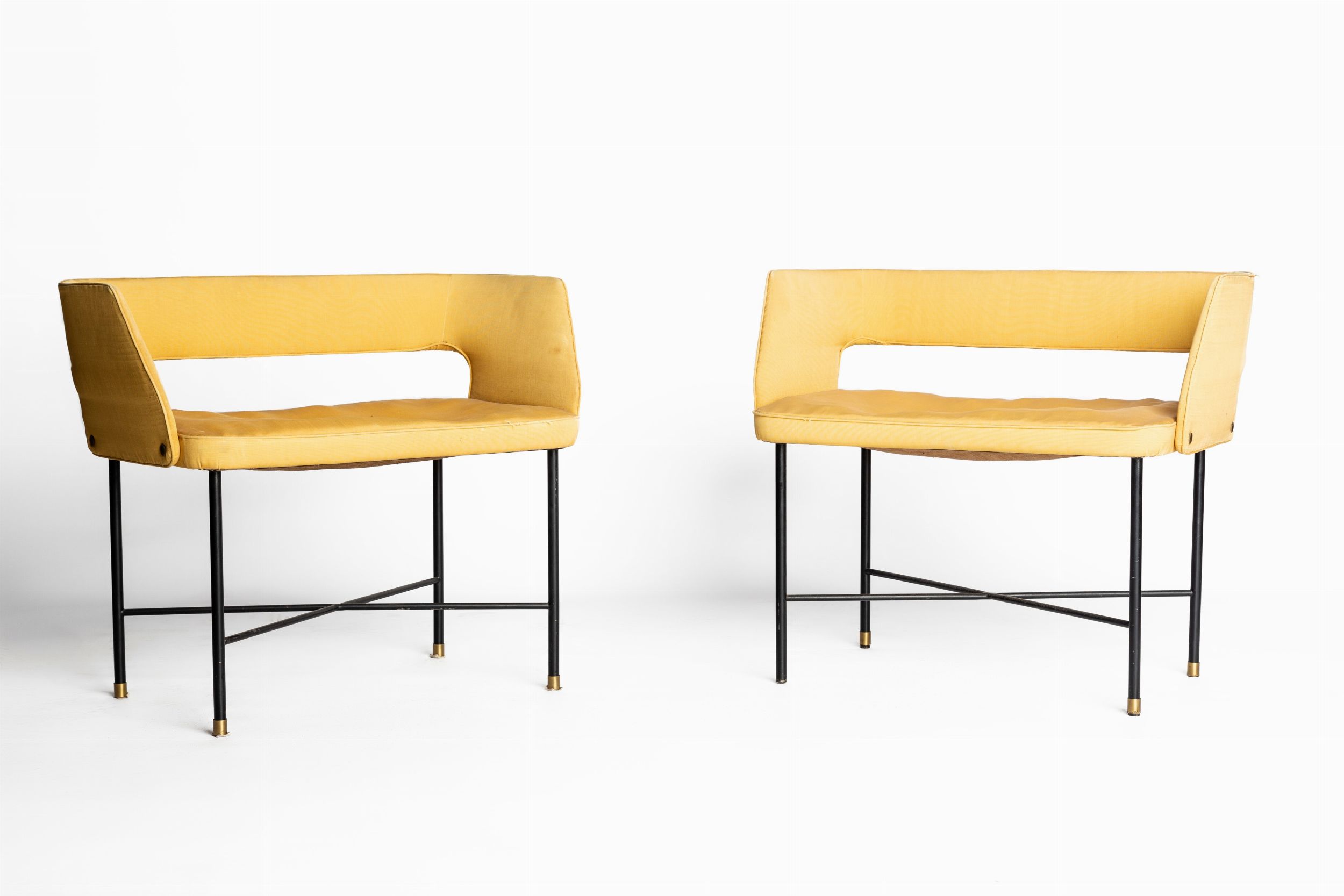 1950 Bellissimo set di sedie vintage di colore giallo realizzate con struttura in metallo verniciato astragale, imbottitura rivestita in tessuto, estremità in ottone.