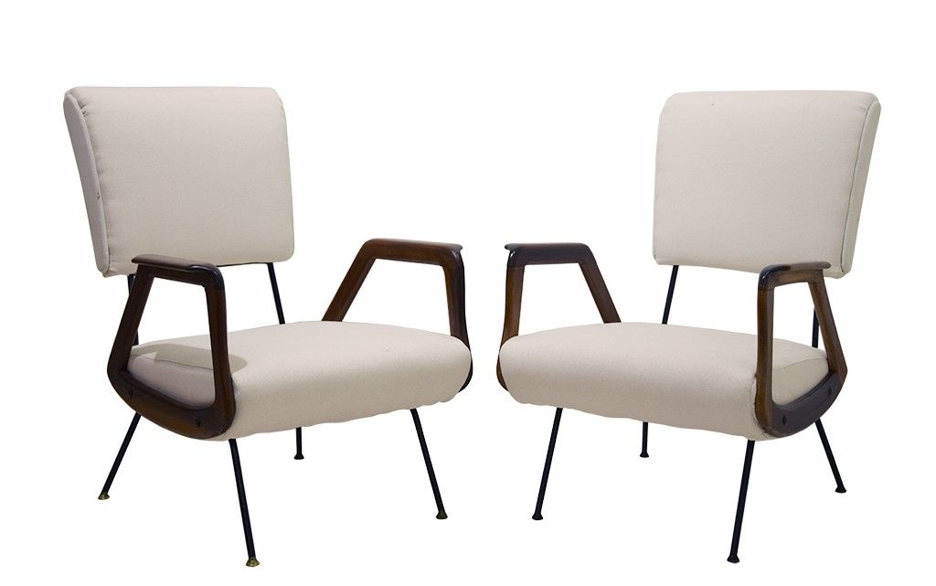 1950s Struttura in metallo verniciato e ottone, braccioli in legno, imbottitura rivestita in tessuto.