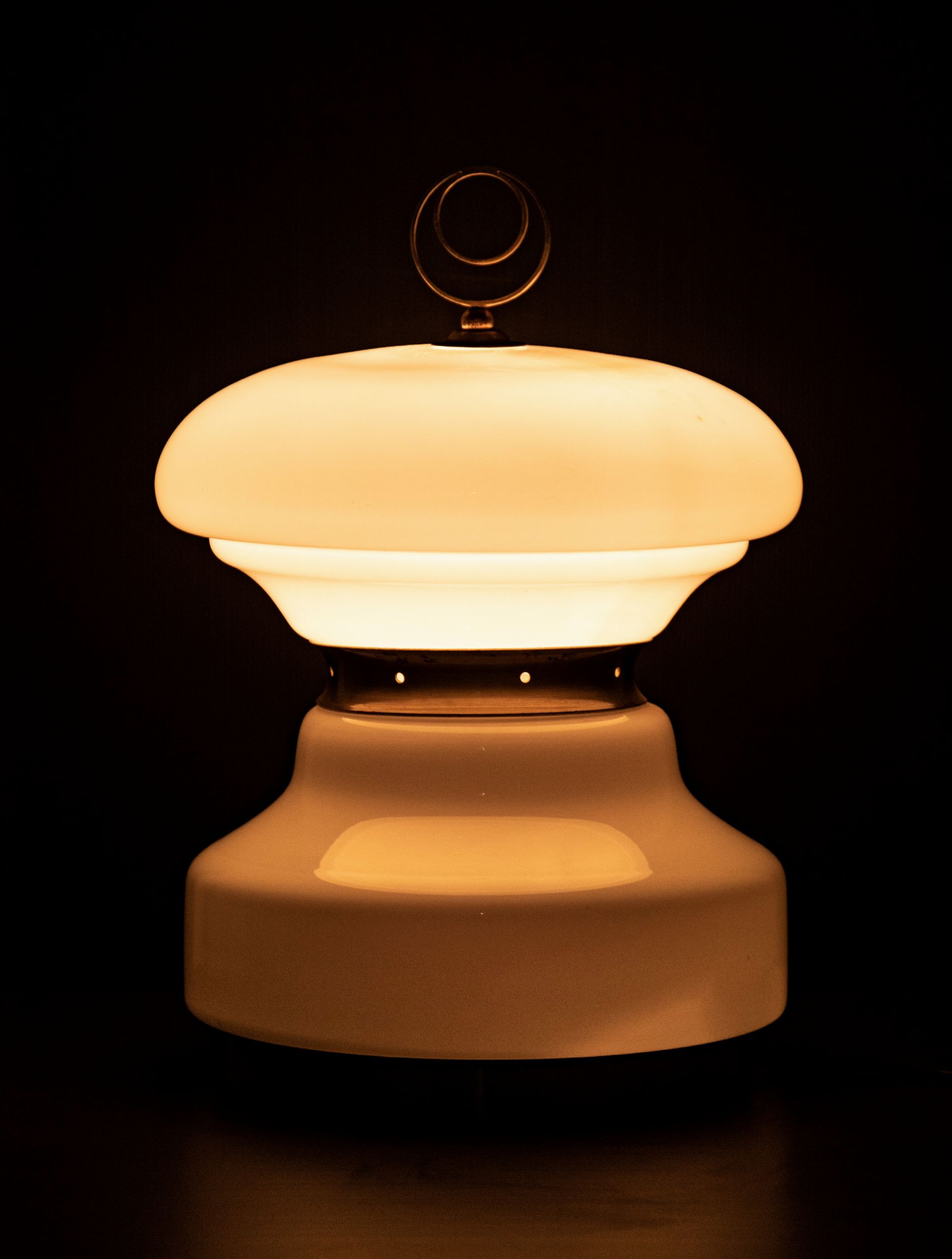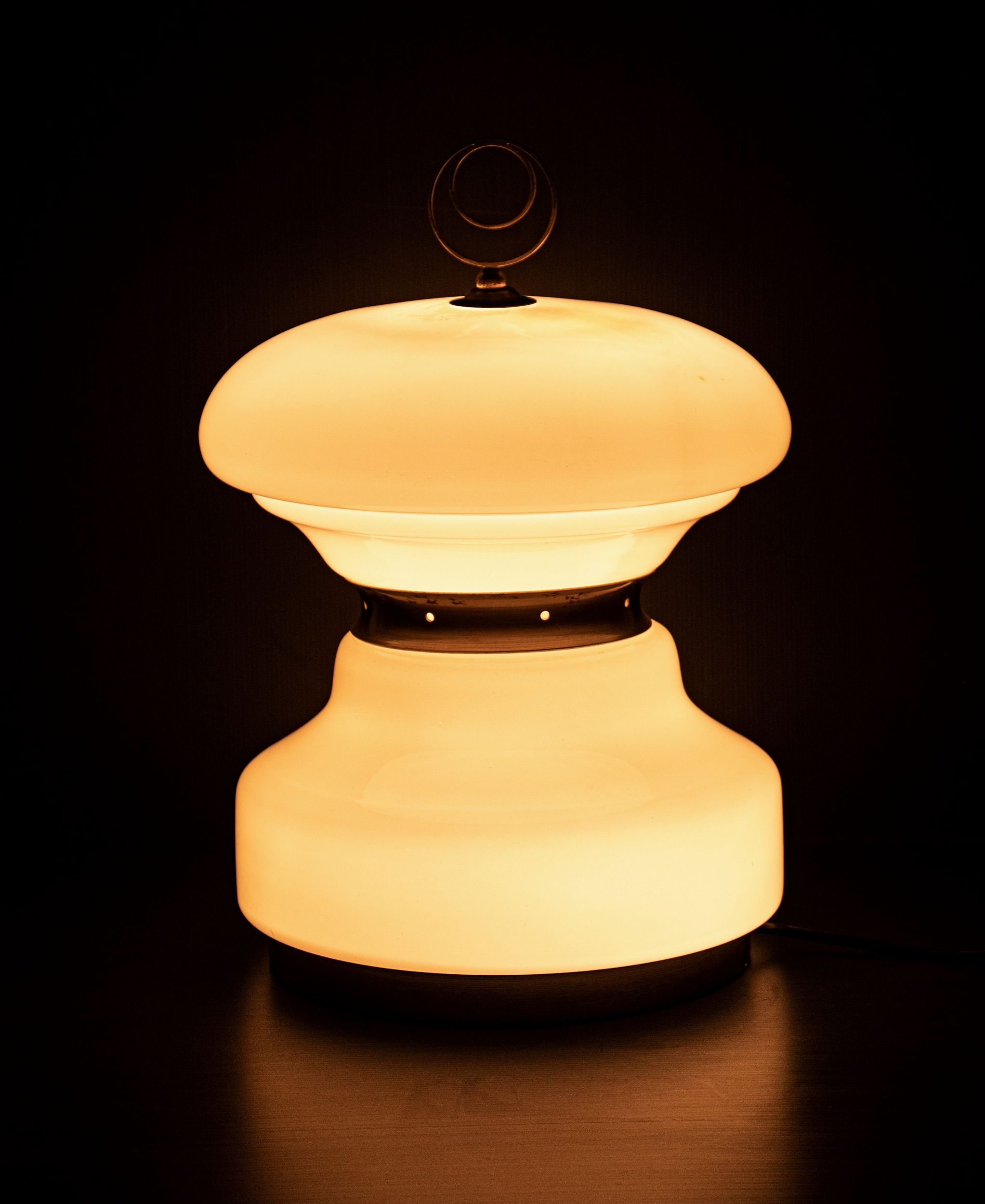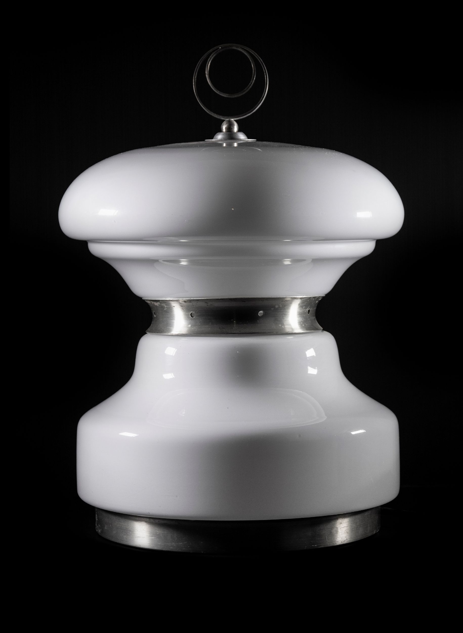 1970s Una bella lampada vintage composta da due moduli che possono essere accesi insieme o singolarmente, realizzata in vetro bianco.