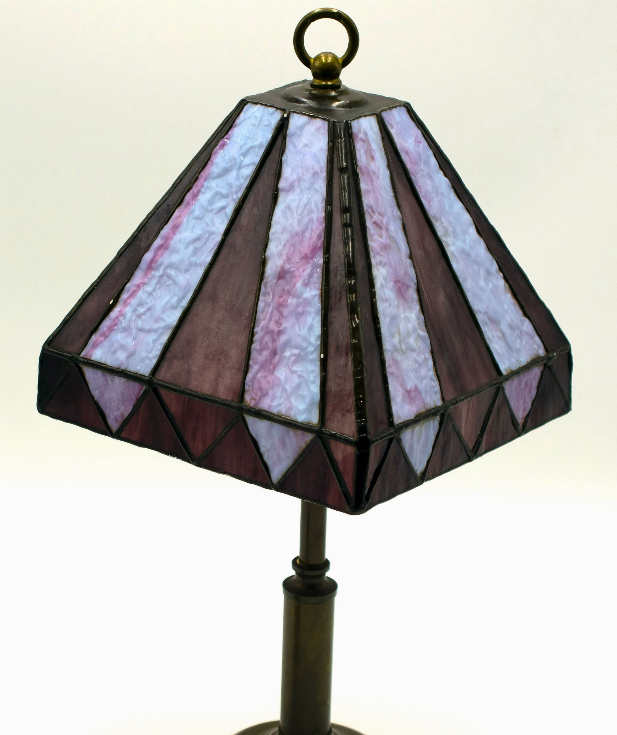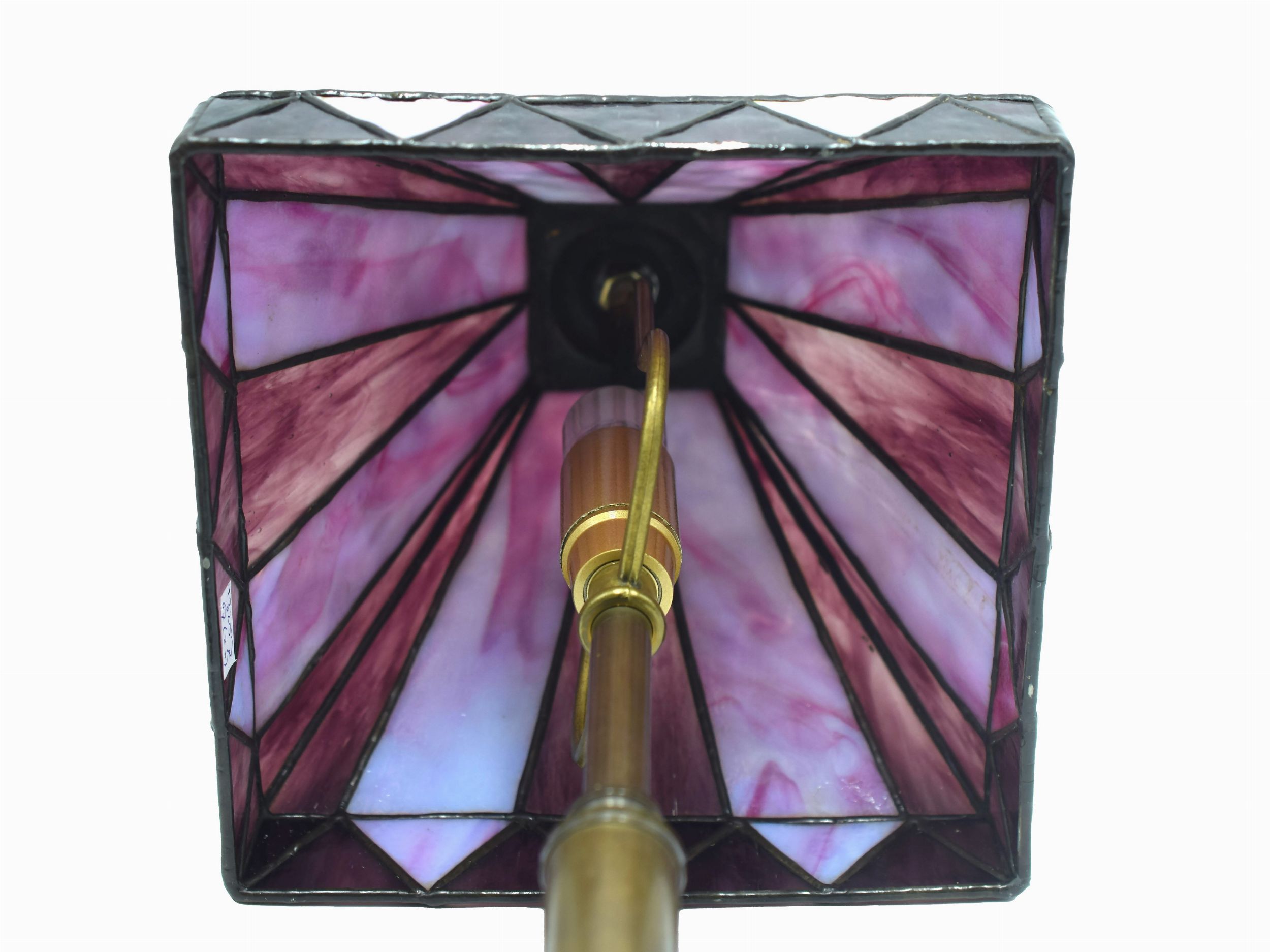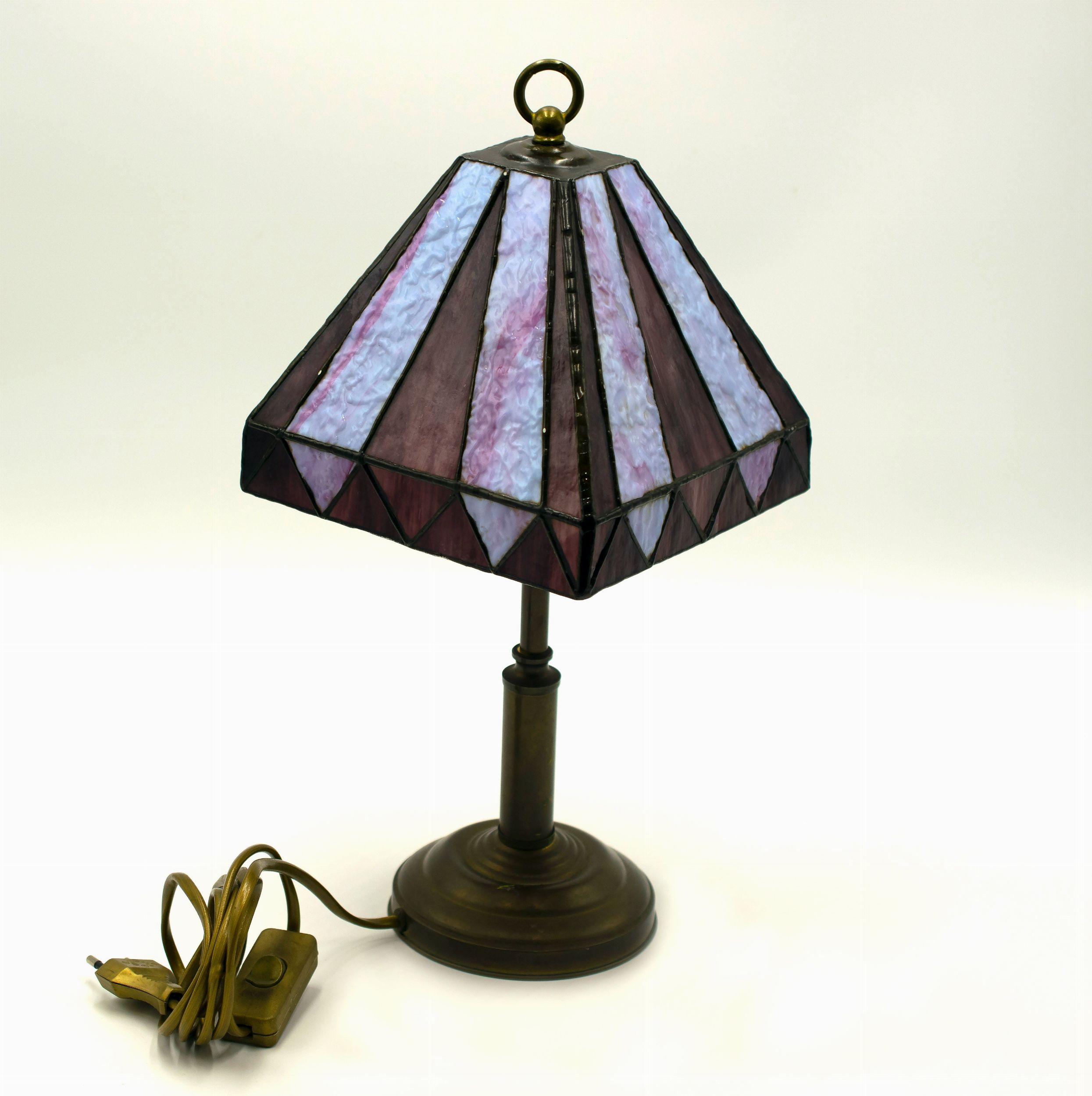 28x41 cm. 1950s Questa lampada da tavolo in stile Tiffany è un'elegante lampada di design prodotta nella seconda metà del XX secolo, probabilmente alla fine degli anni Cinquanta. Design caratterizzato da una base in ottone e da uno splendido paralume in viola e bianco.