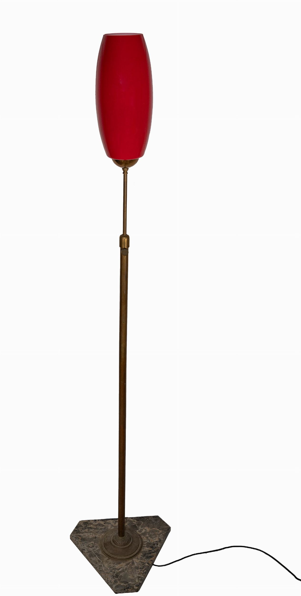 XX secolo Lampada da terra in vetro rosso, base in metallo, ottone e marmo di forma geometrica.