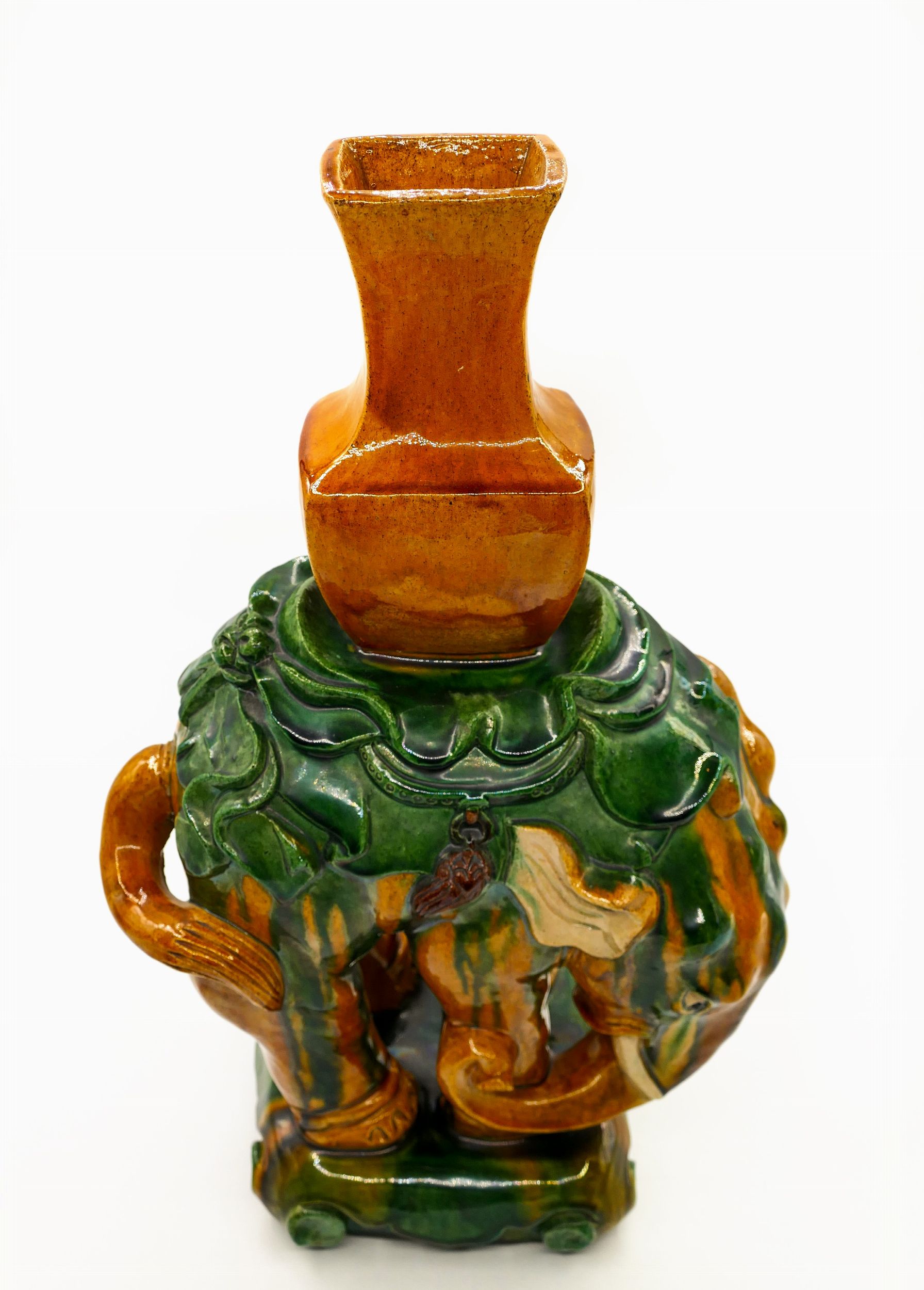 Una preziosa statuetta in pietra arenaria smaltata verde e gialla con un vaso sulla sommità .