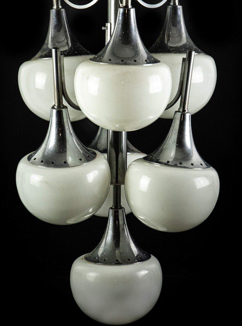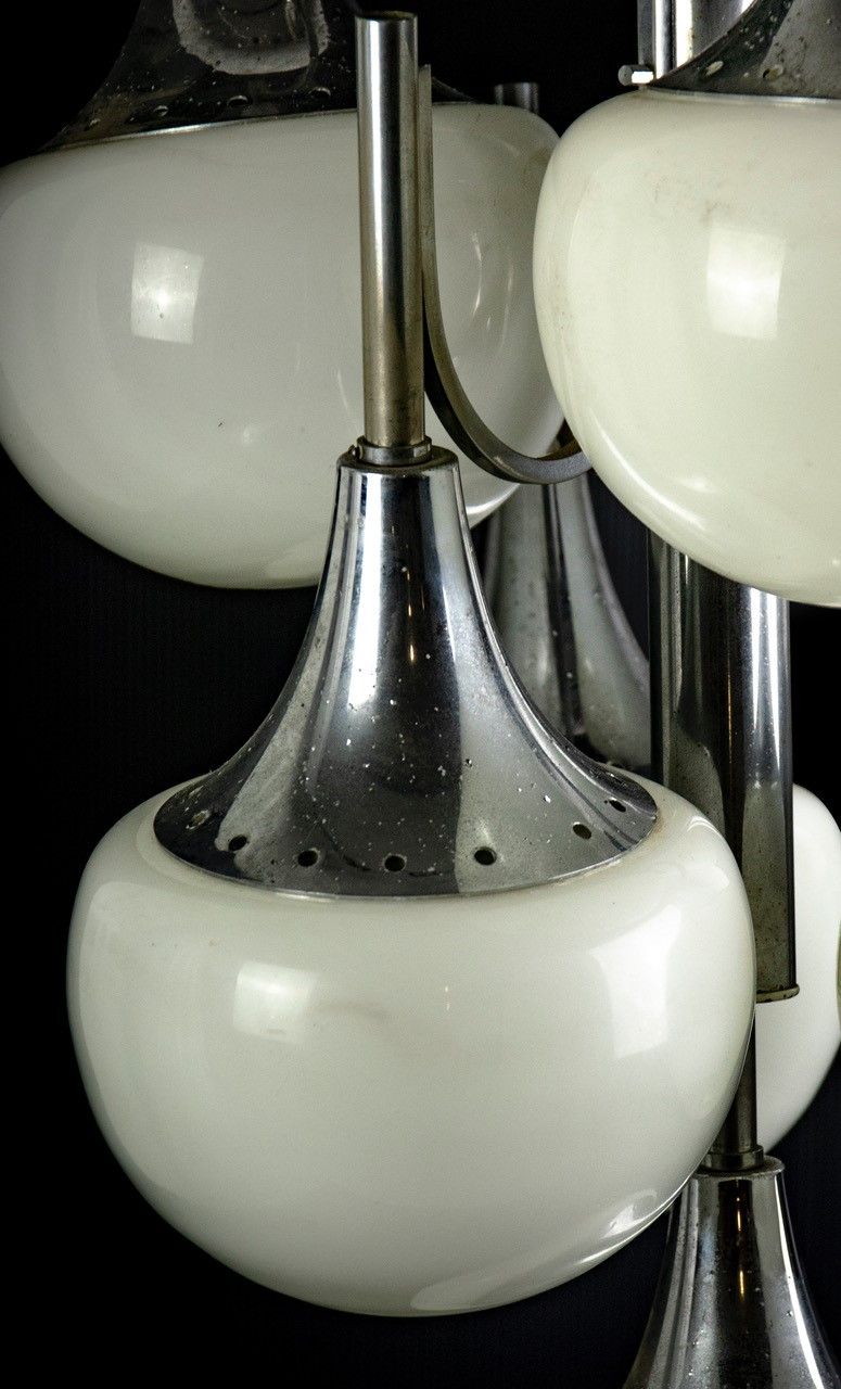 1970s Lampadario vintage a grappolo in acciaio con sfere di vetro bianco realizzato dal famoso designer Gaetano Sciolari. Buone condizioni, tranne che per i segni dovuti al tempo.