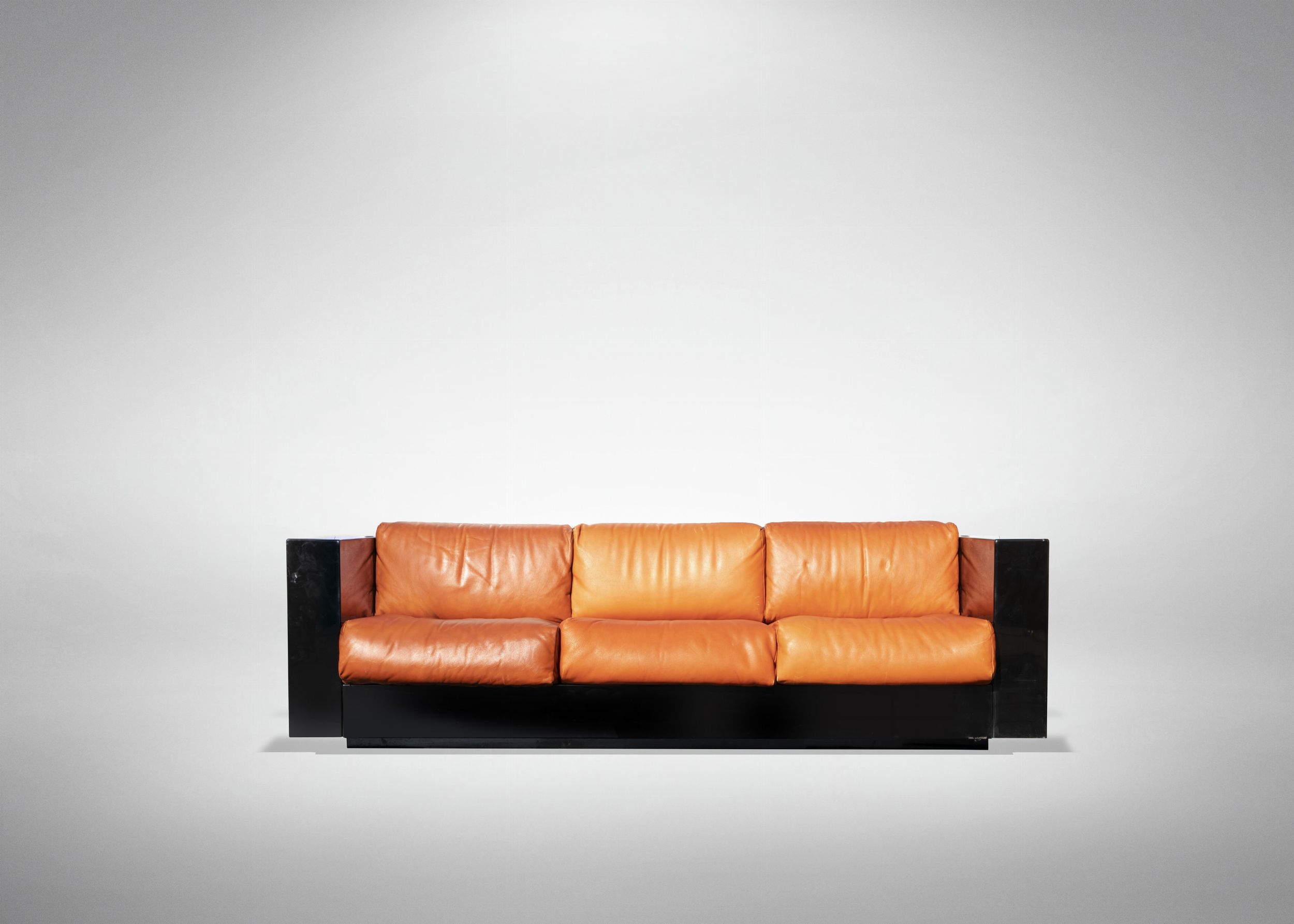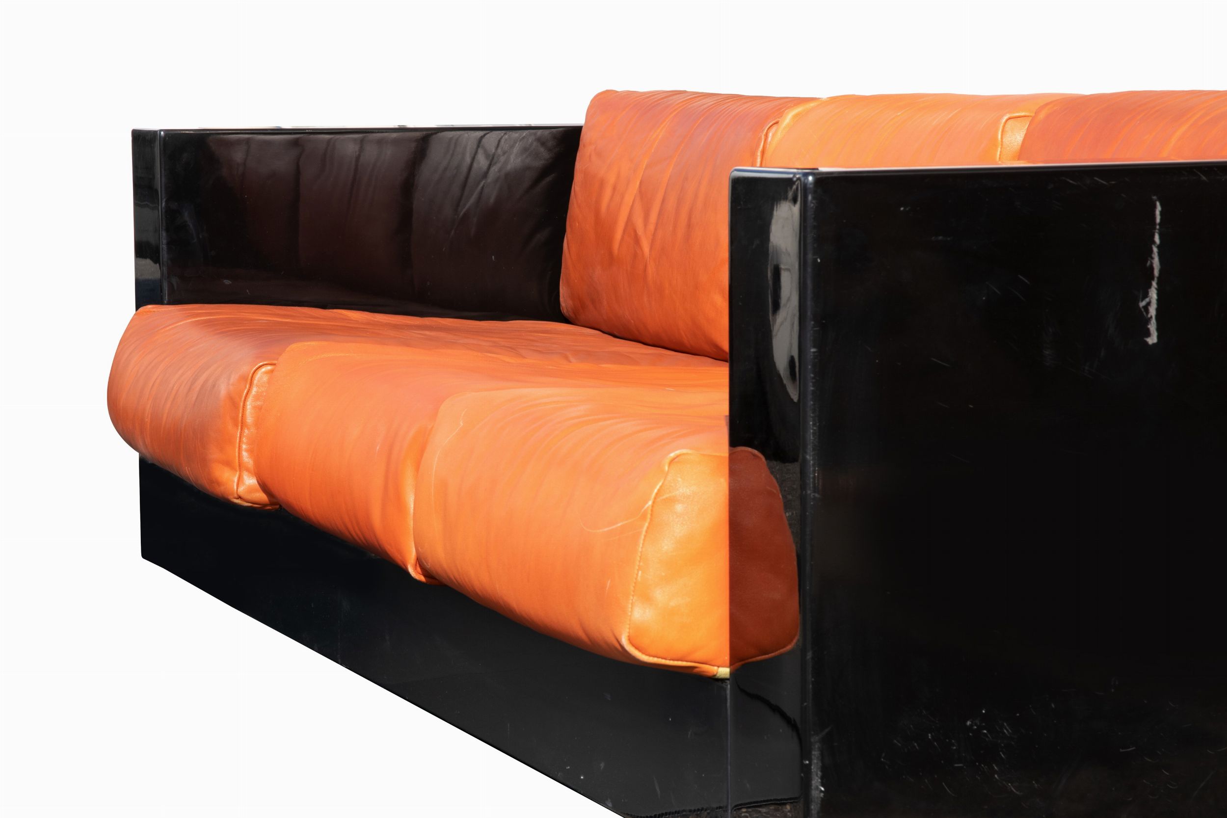 1970 Poltrona/Sofa Saratoga disegnata da Massimo e Lella Vignelli in legno laccato e pelle arancione. Buone condizioni a parte alcuni graffi sui bracci, in particolare sul braccio sinistro, e sui bordi inferiori.