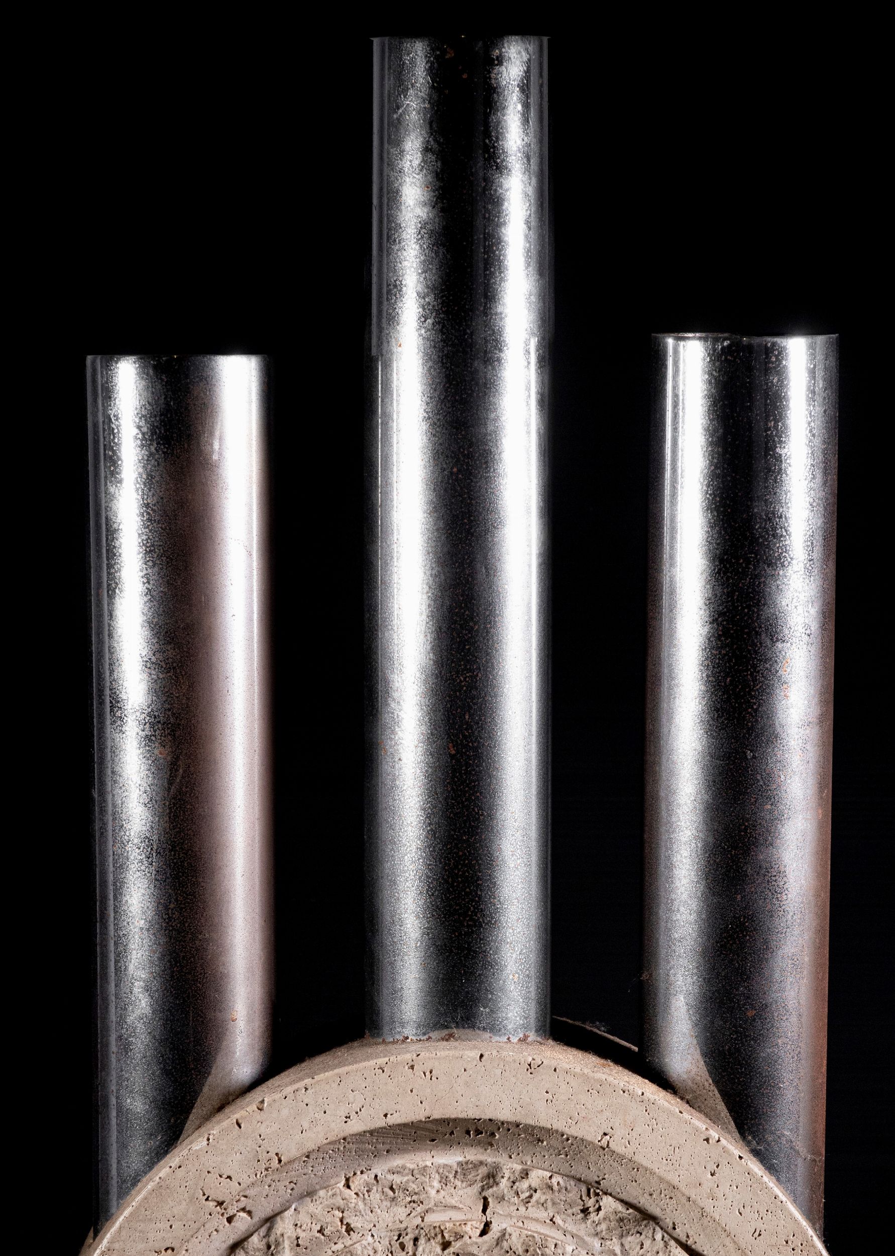 Bellissimo e raro portaombrelli a tre cilindri cromati e base in travertino di Rapolano della ditta Fratelli Mannelli, famosa negli anni '70 per l'utilizzo di questo particolare e pregiato materiale in tutte le sue creazioni.