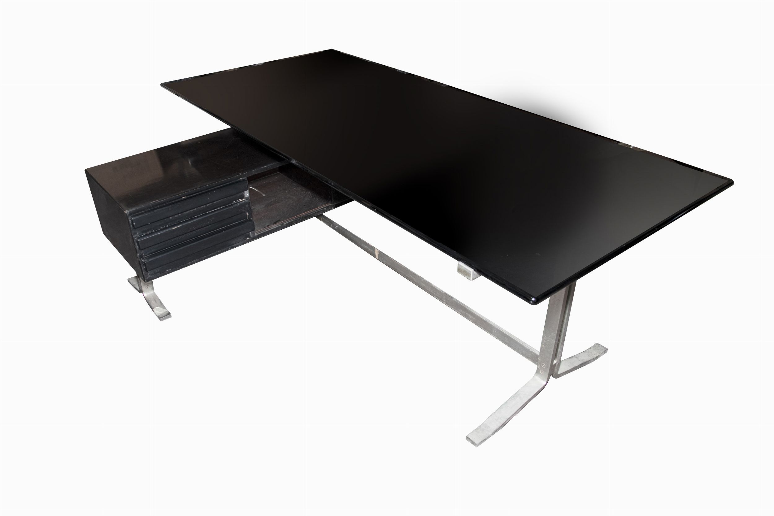 1970 Scrivania angolare vintage in legno laccato nero con gambe in metallo cromato spazzolato; top in vetro; Realizzata da Moscatelli per Formanova.