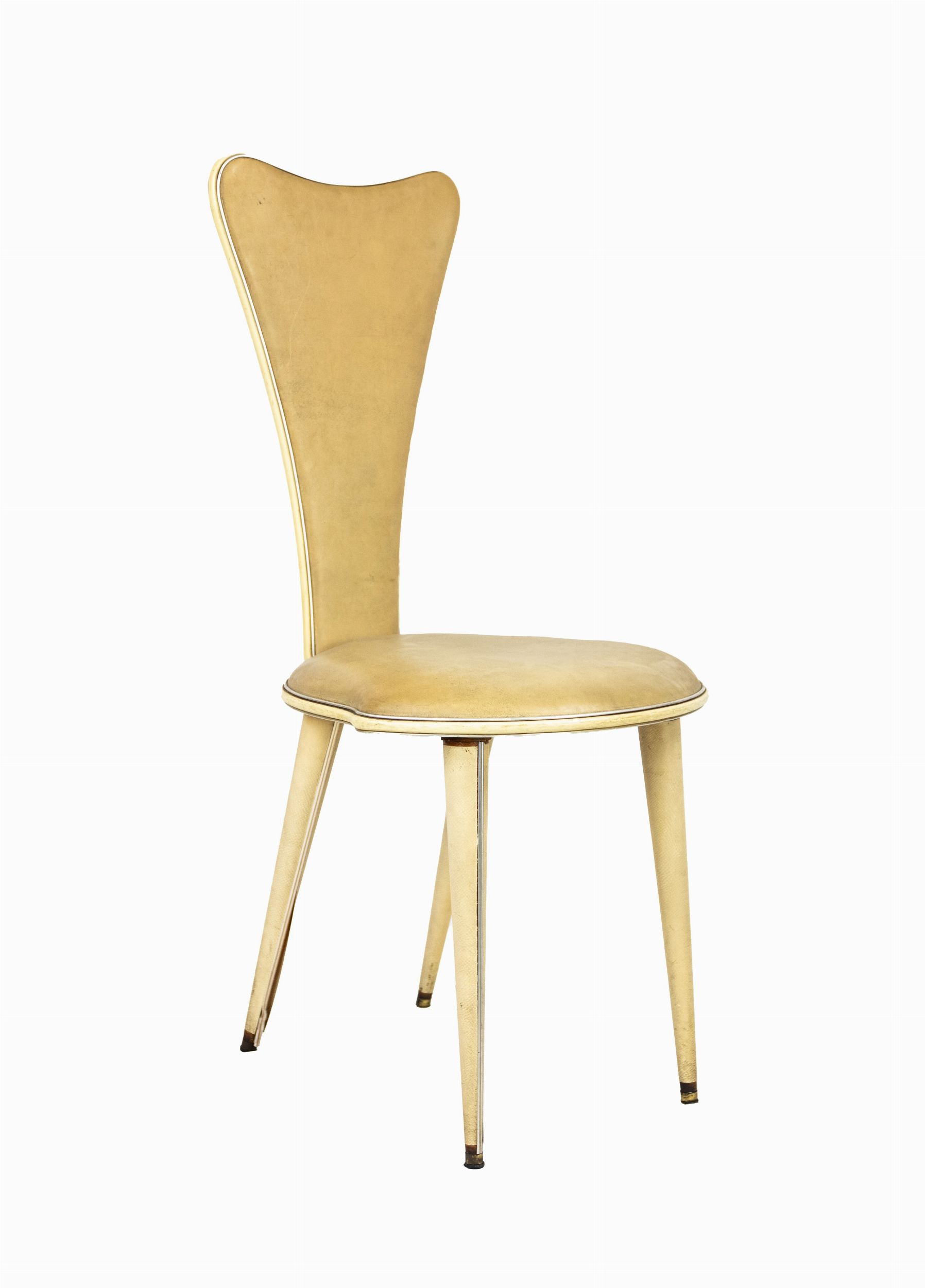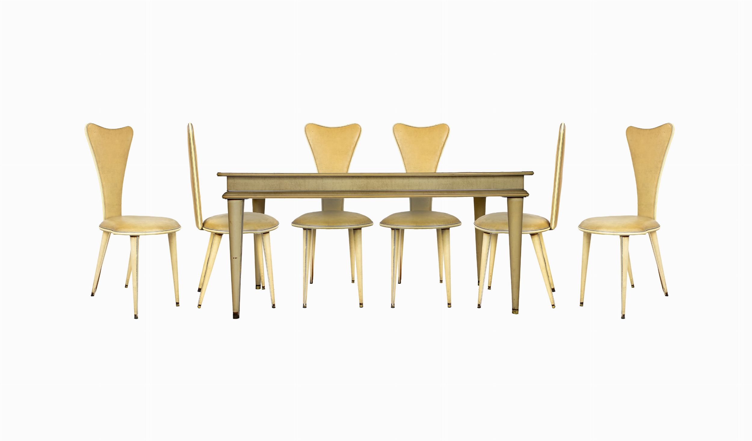 1970 Set di sei sedie e tavolo da pranzo. Alcuni segni di usura.