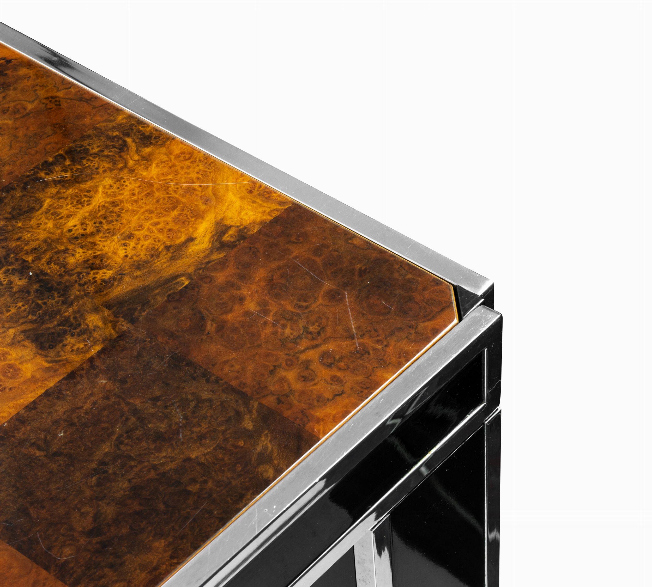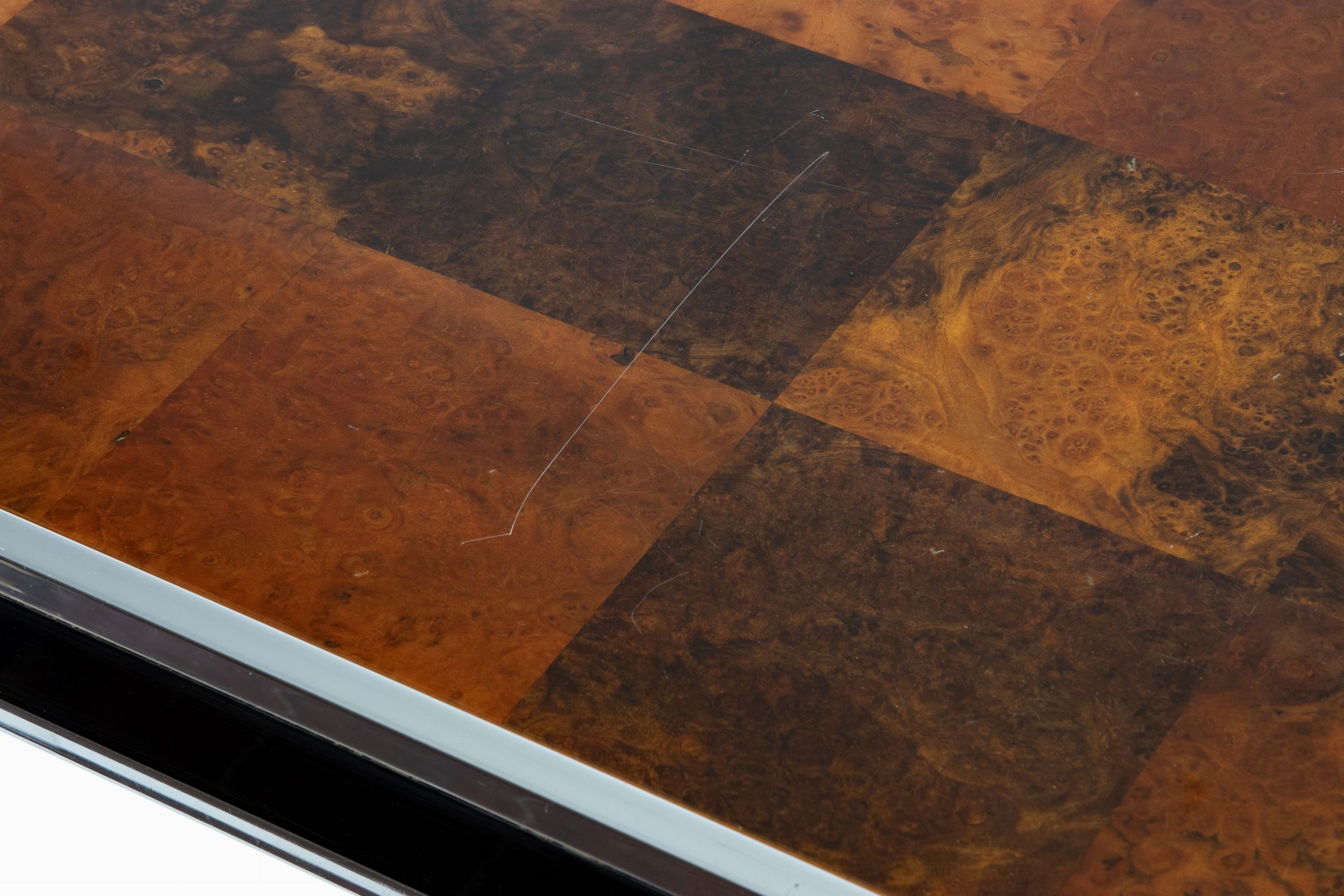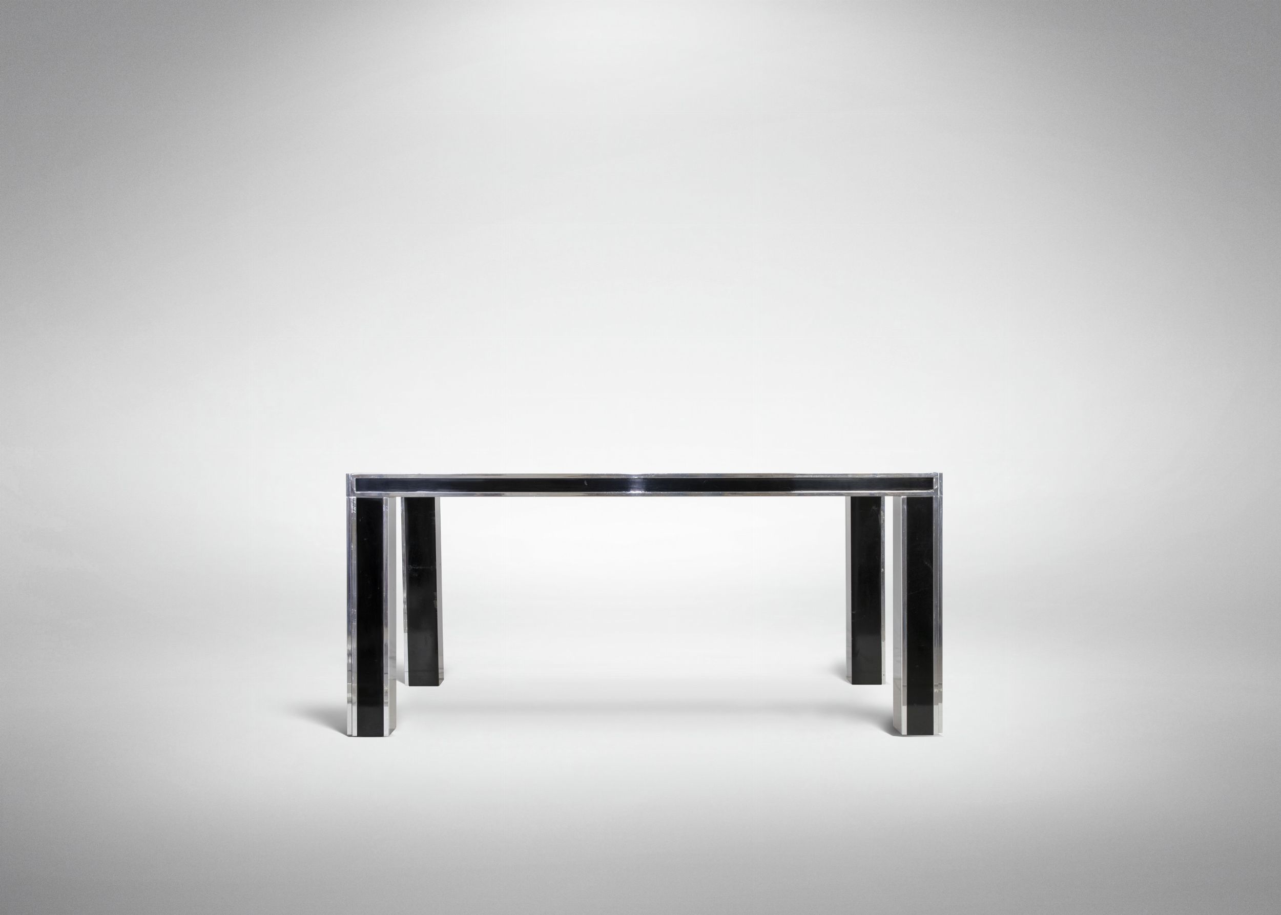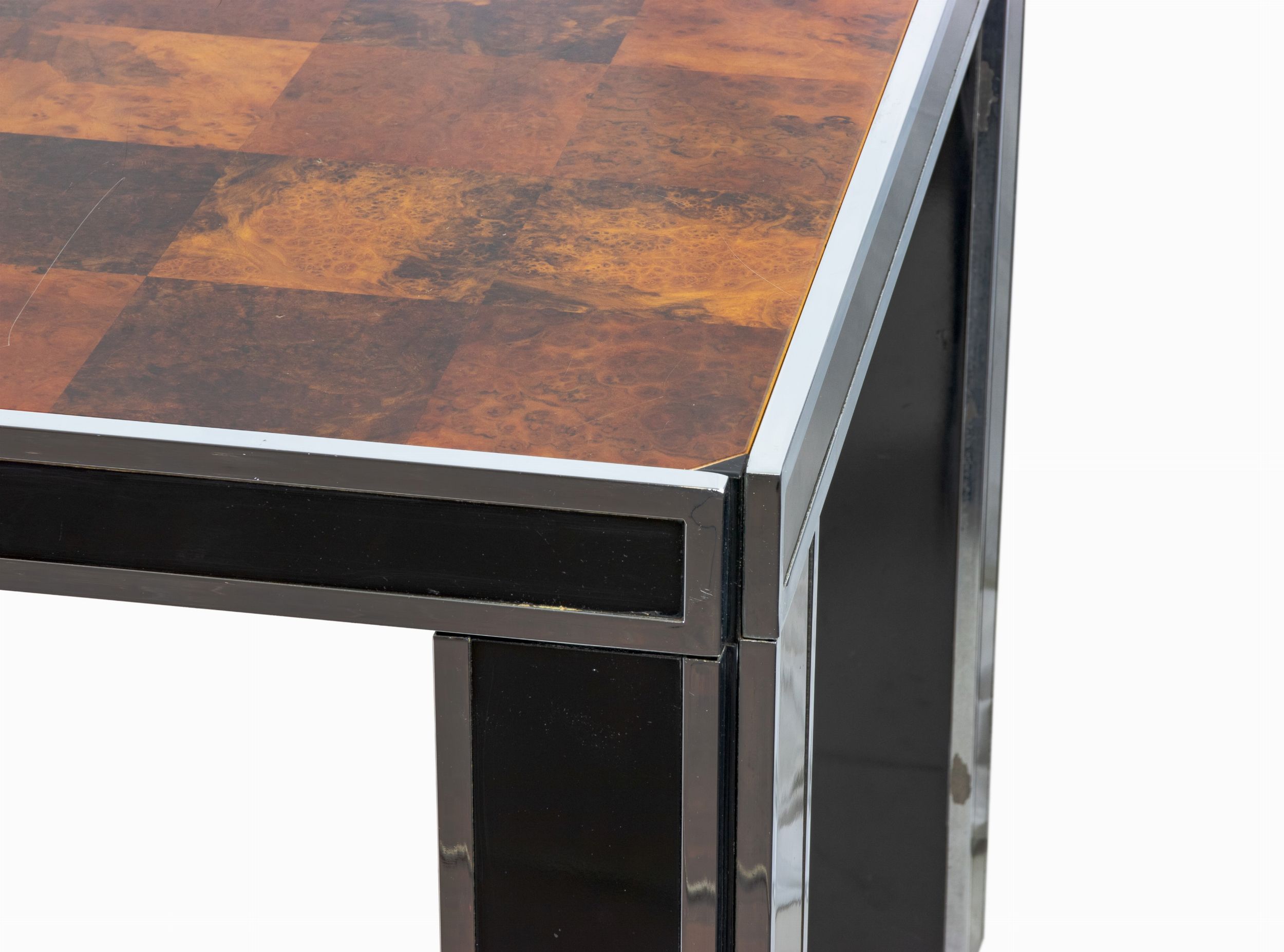 Anni '70 del XX secolo Piano in noce con gambe in metallo cromato e laccato nero