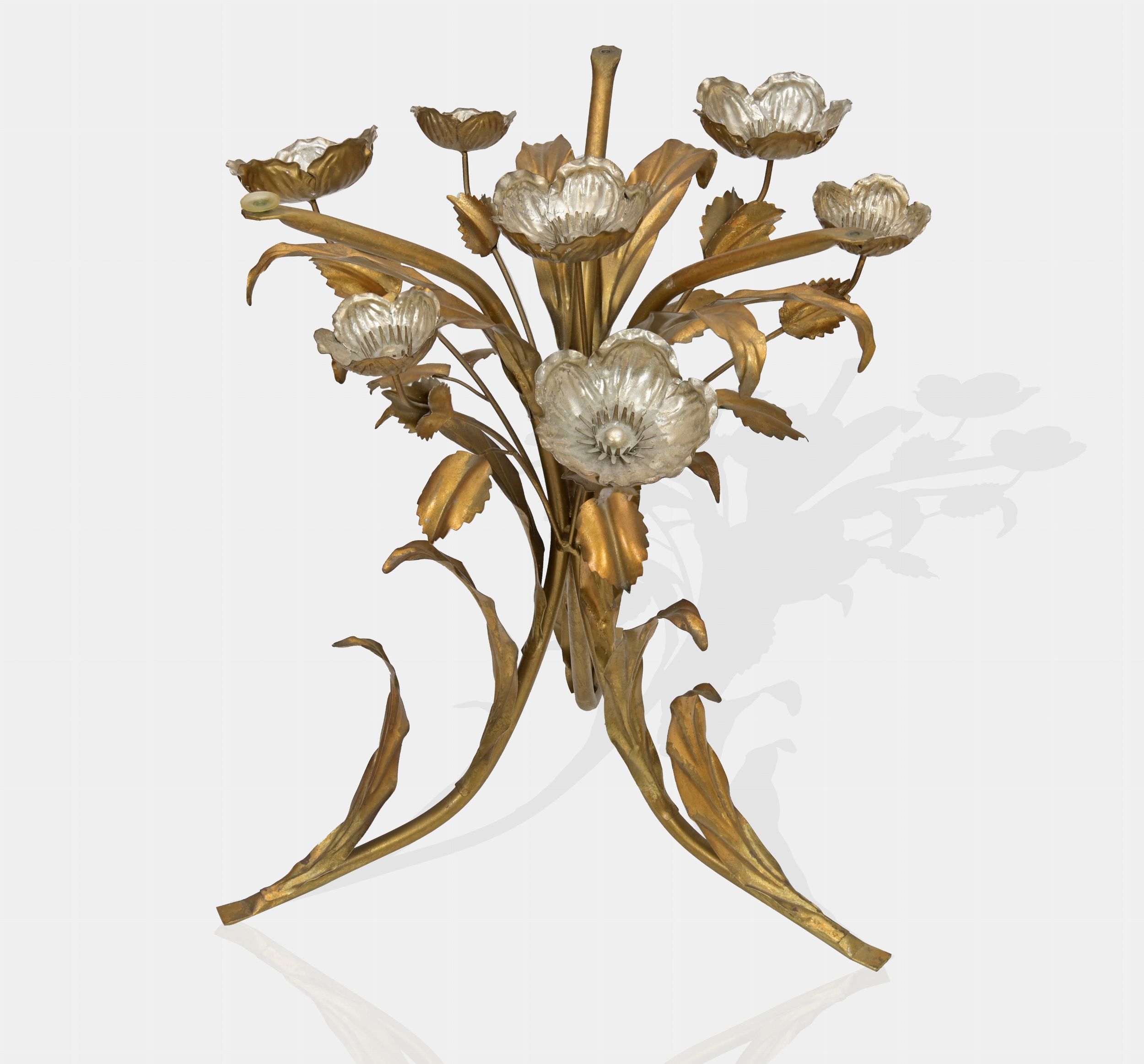 1980s Ottone e vetro lavorati a mano. Base del tavolo: altezza 52 cm; profondità massima 53;