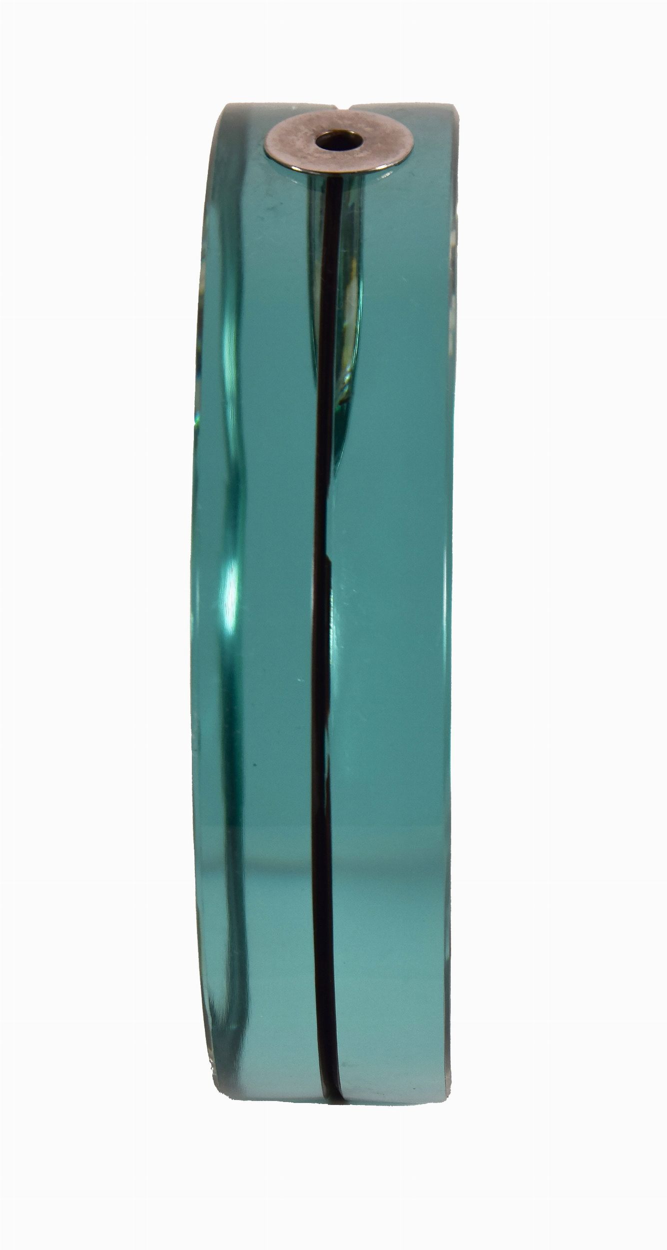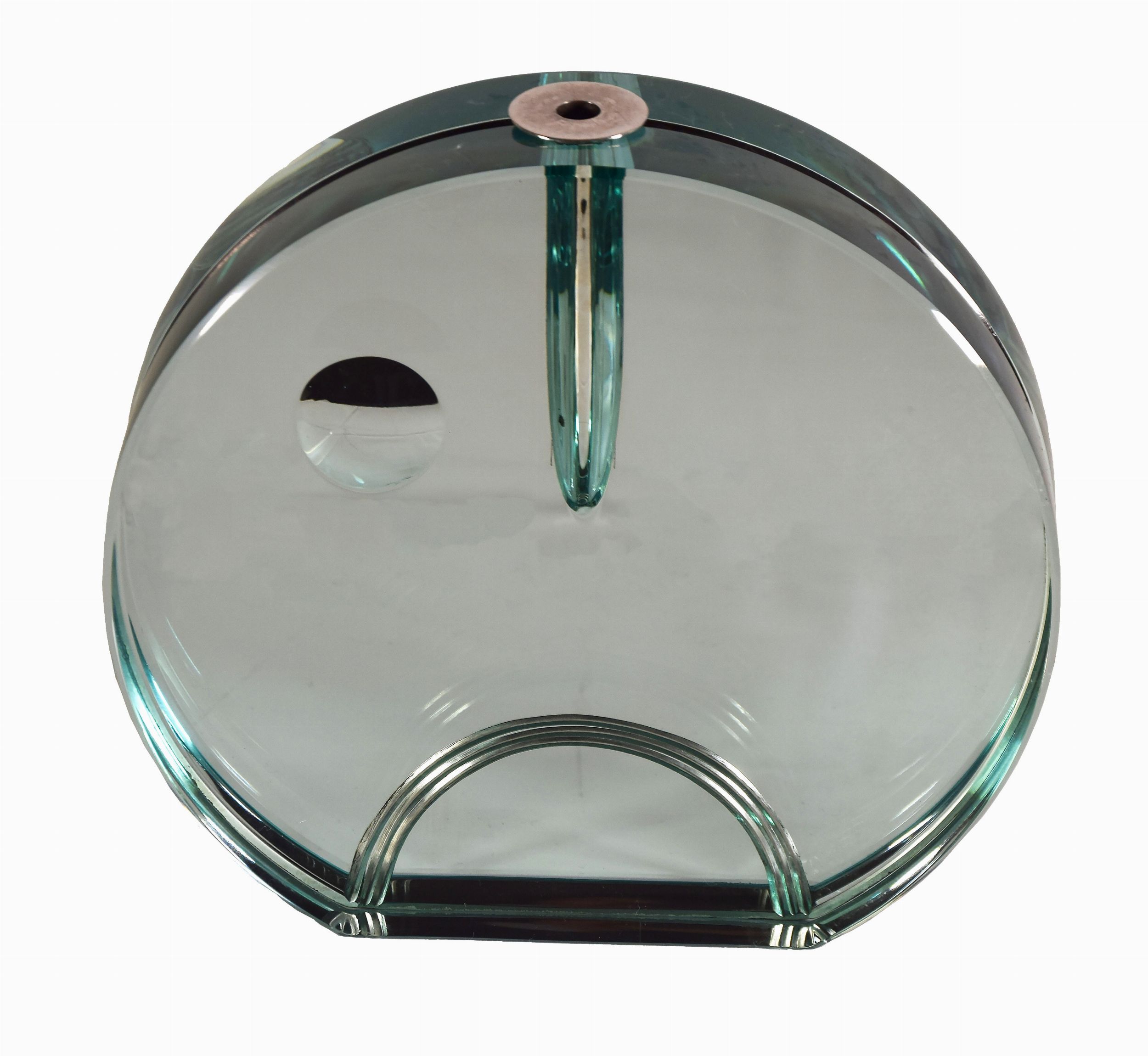 Vaso circolare verde in metallo cromato e cristallo tagliato.
