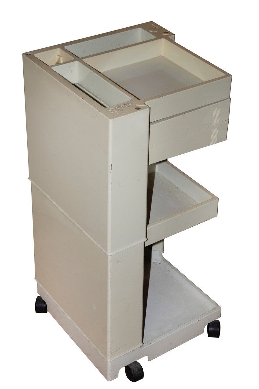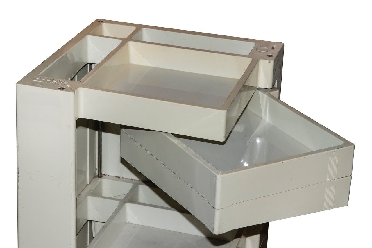 XX secolo Disegnato da Joe Colombo per B-line, questo carrello ha struttura e cassetti in materiale plastico ABS stampato a iniezione. Tiranti, viti e perni in acciaio zincato. Ruote in polipropilene.