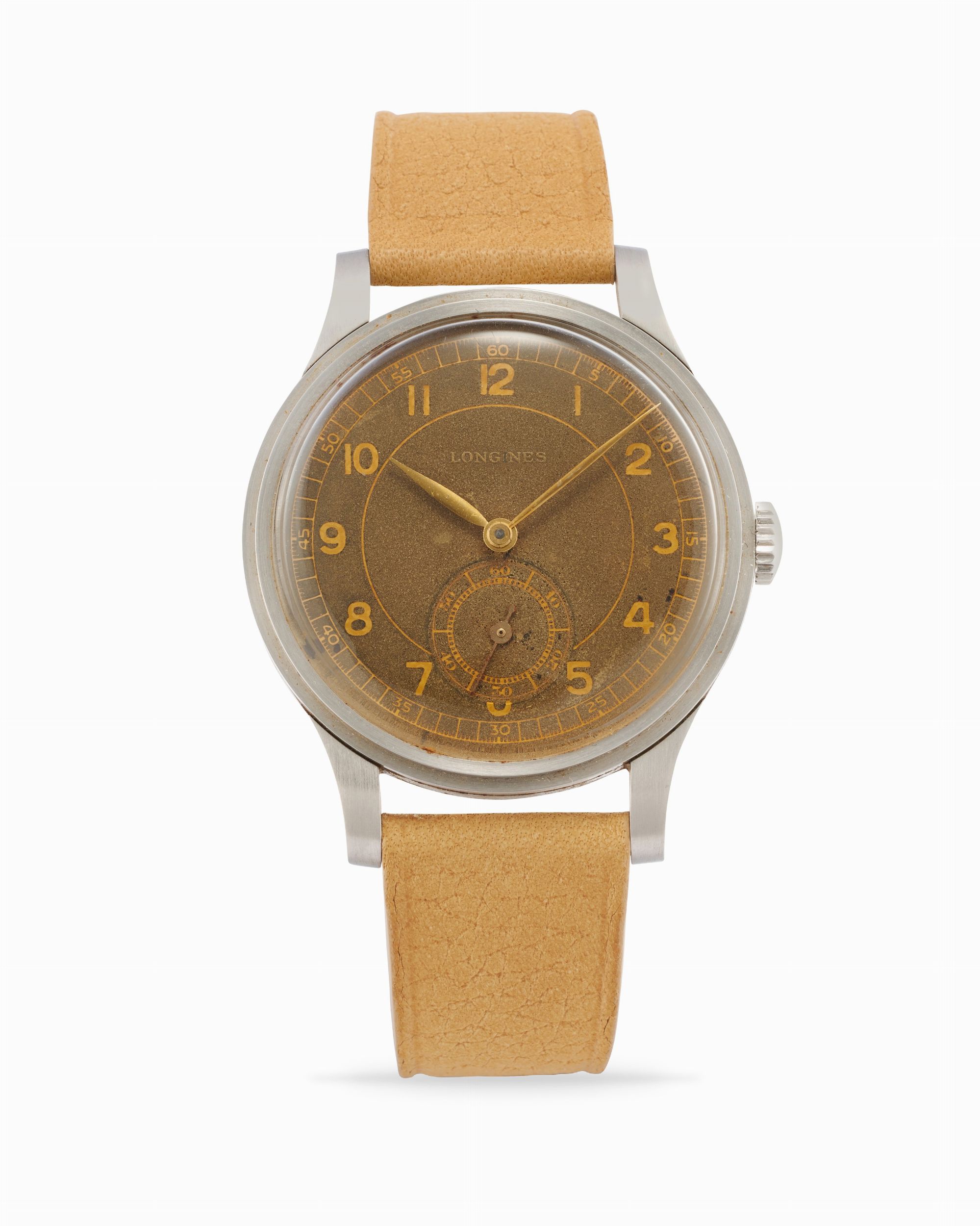 anni 50 Cassa rotonda in acciaio, lunetta a gradini.Quadrante nero virato al marrone, numeri arabi dipinti.Movimento a carica manuale, cal. 12.68Z, n.8214301.Cinturino in pelle.Dimensioni: 37 mm.Accompagnato da estratto d'archivio Longines.