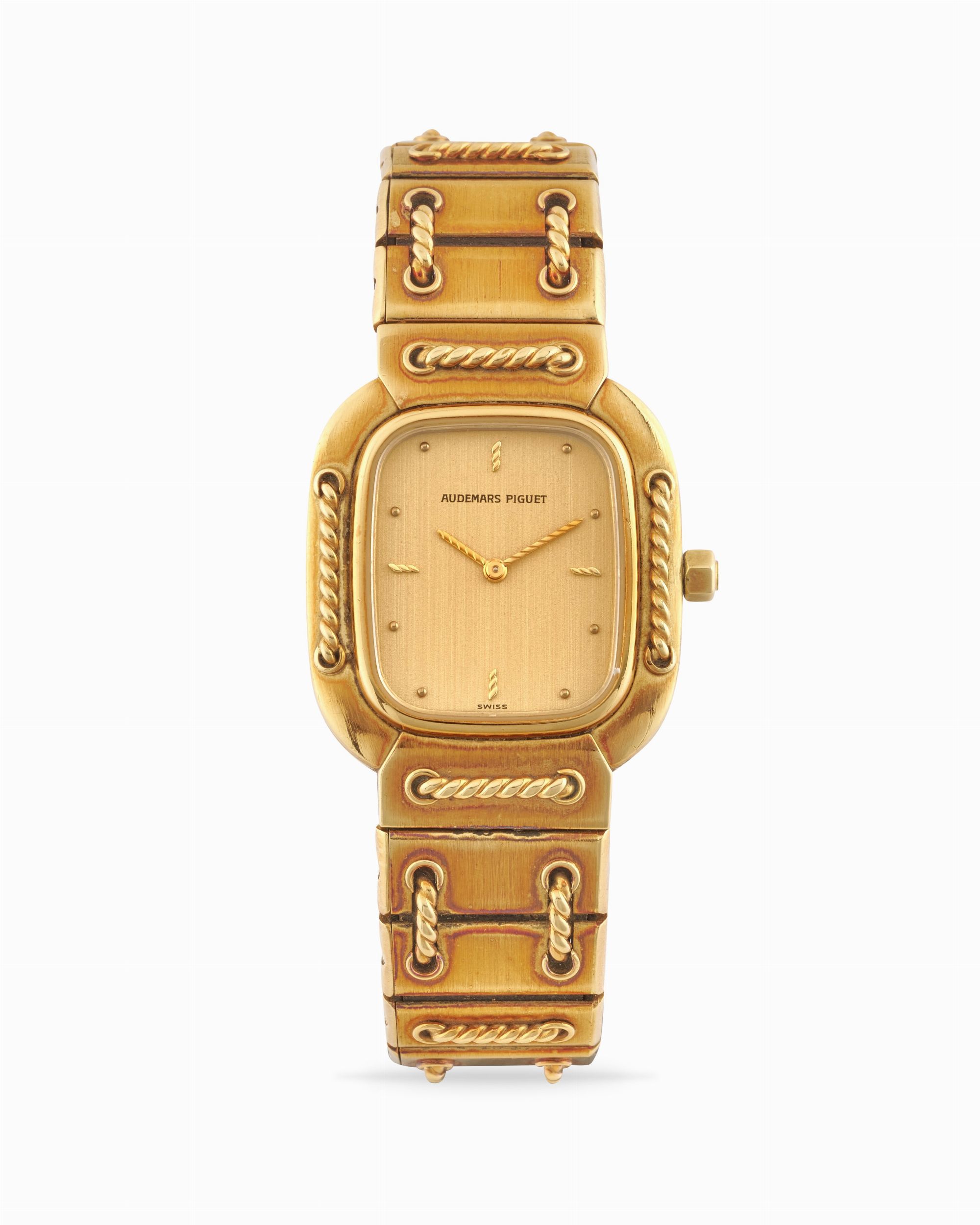 Bracciale integrato Audemars Piguet con decori a forma di corda in oro 18k, fibbia deployante in oro bianco 18k.