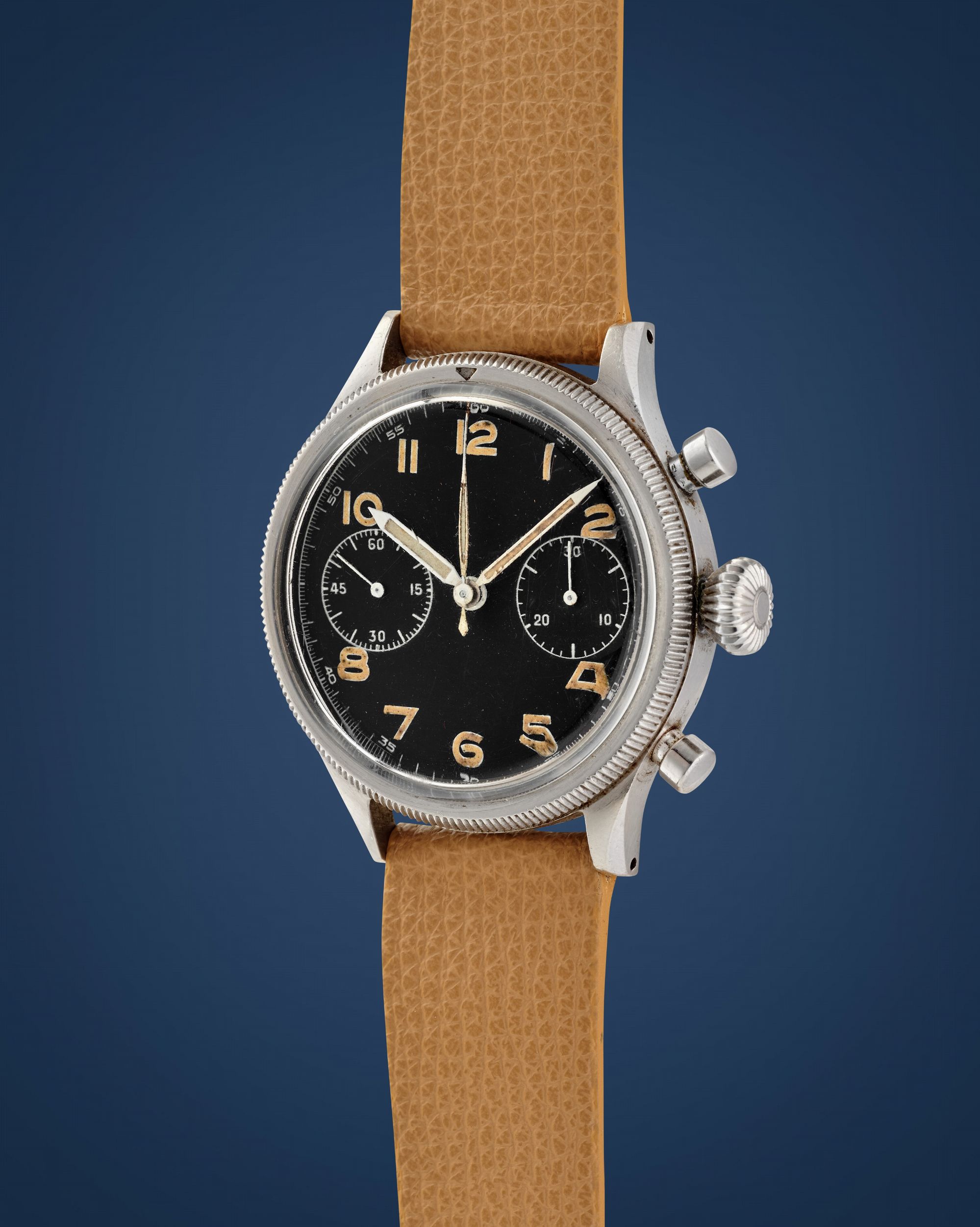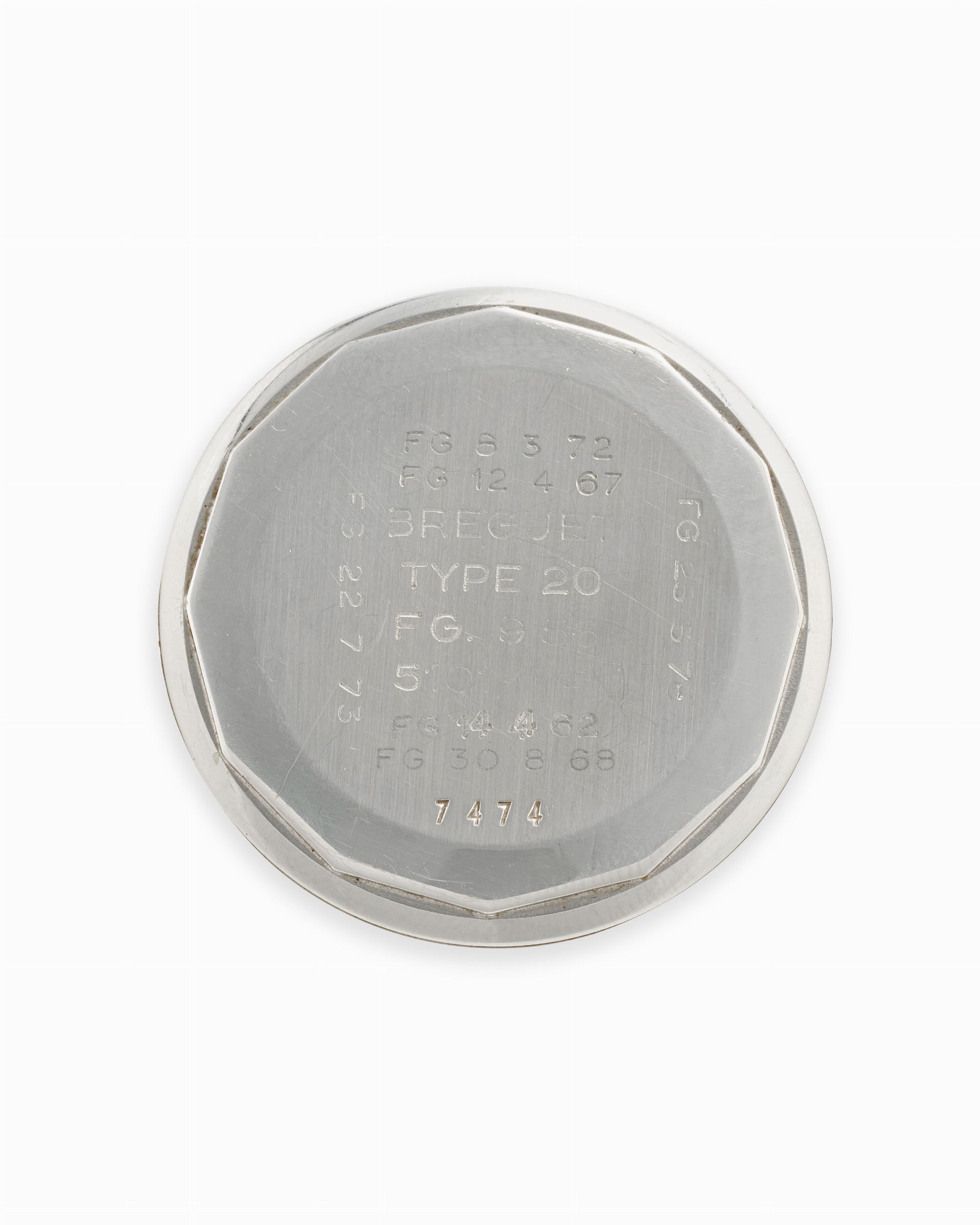 anni 50 Cassa rotonda e ghiera girevole in acciaio, n.7474, fondello a vite con incisioni Fin de Garantie, pulsanti tondi, anse sfaccettate.