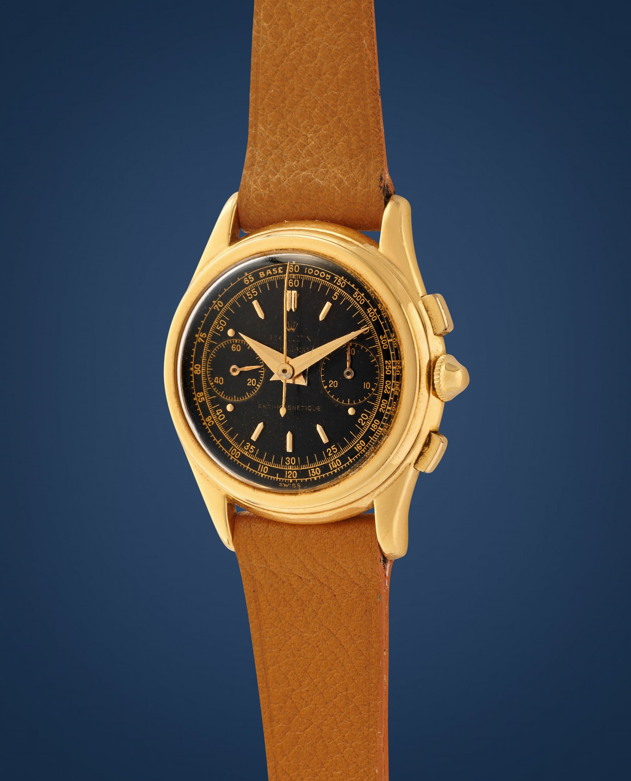Cinturino in pelle e fibbia Rolex placcata oro.