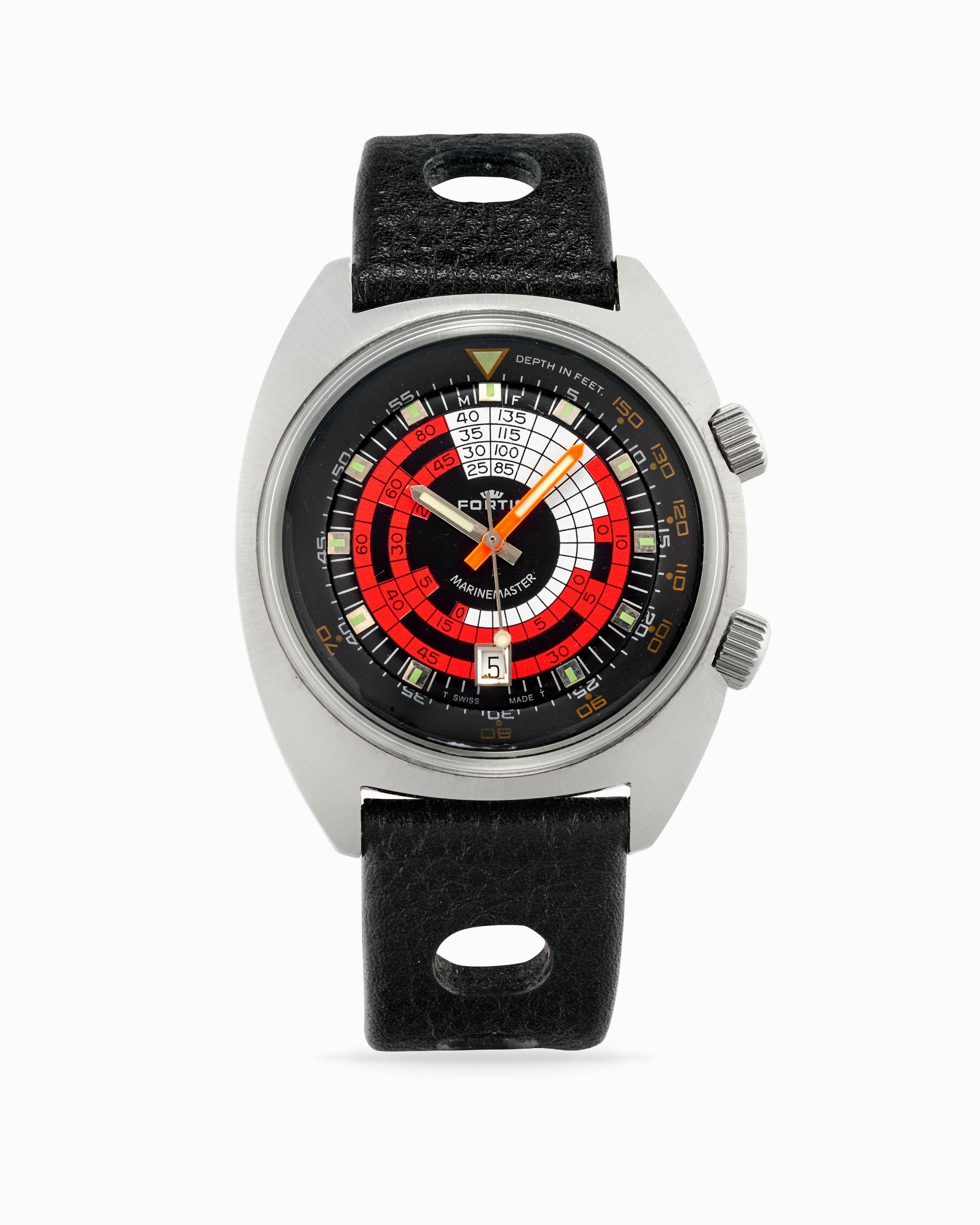 Quadrante nero, rosso e giallo con tavole di decompressione, indici applicati luminescenti, rehaut esterno girevole con numeri arabi dipinti.