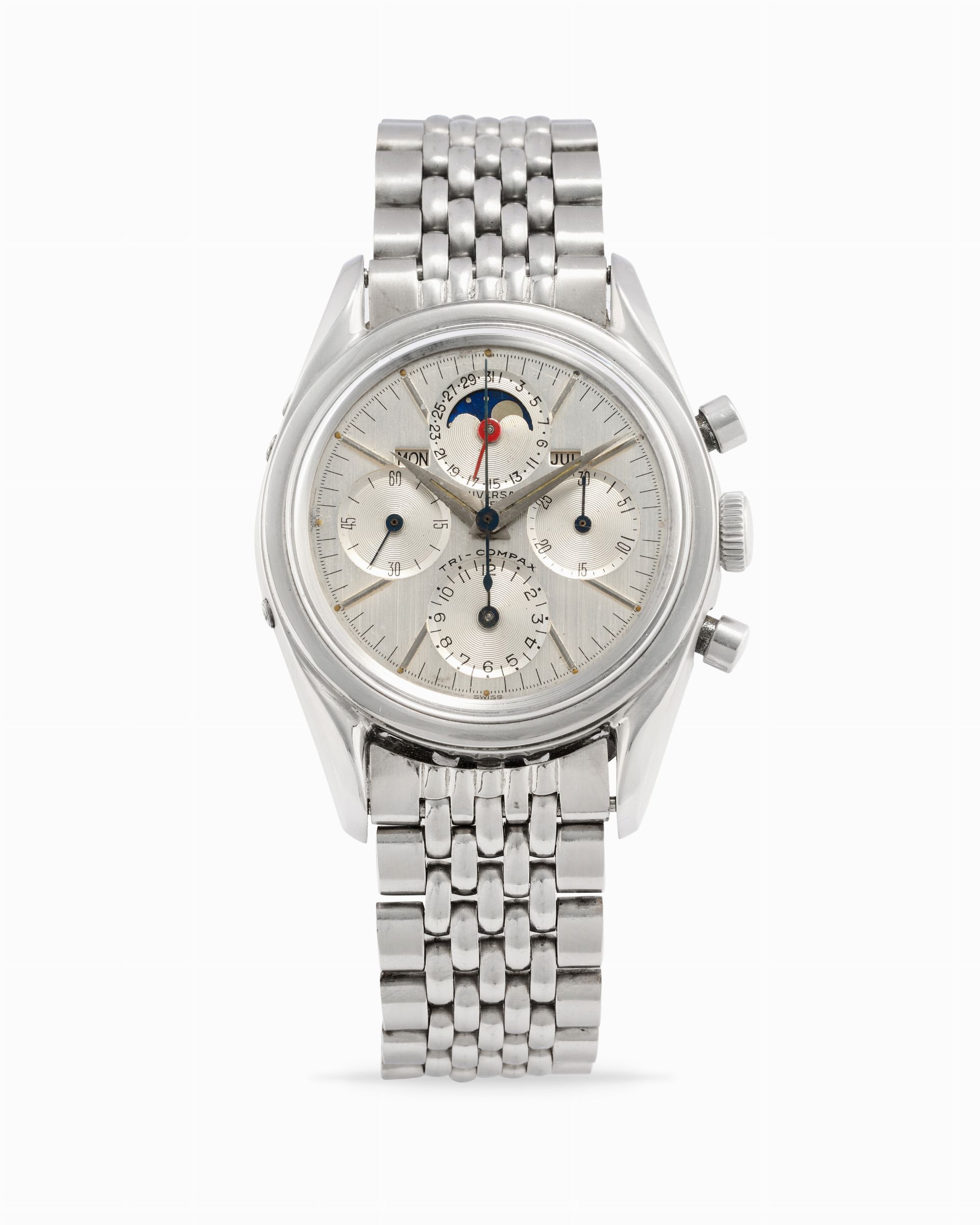 Quadrante argenté con finitura satinata, indici applicati, indicazione della data, giorno della settimana e mese, fasi lunari.