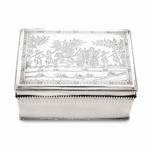 gr 490 circaLargh. 15,3 - Prof. 10,5 - Alt. 8 Cm Coperchio finemente cesellato con raffigurazione di viaggio in [..]