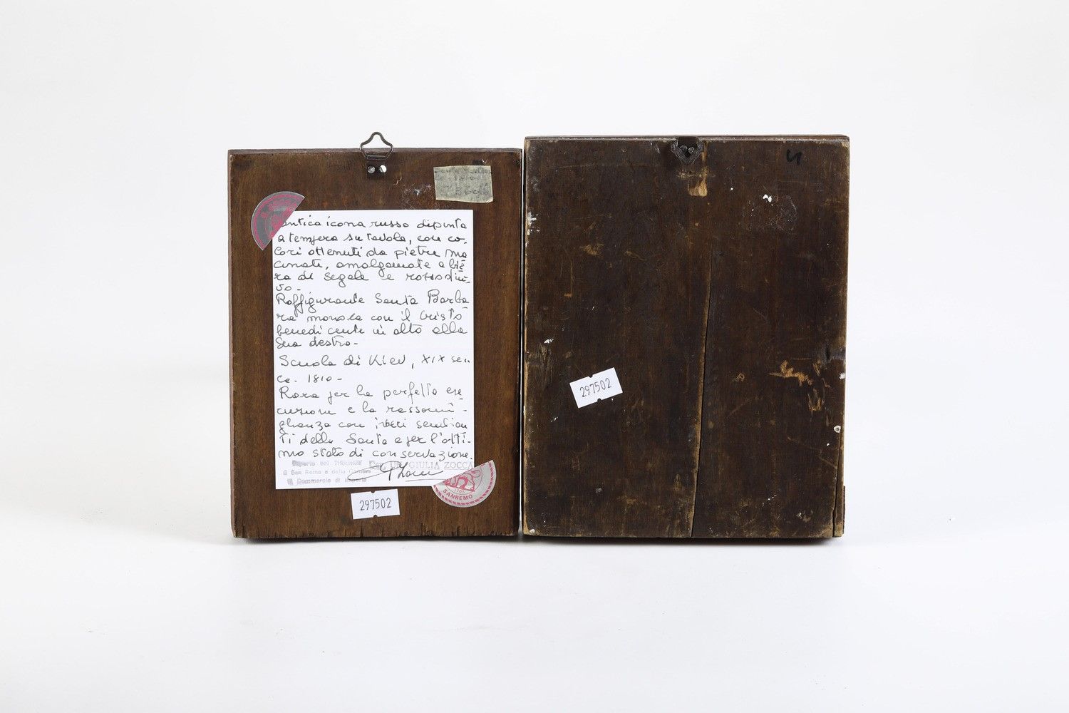 Lotto di due icone a tempera su tavola raffiguranti la Vergine con Bambino e Santa [..]
