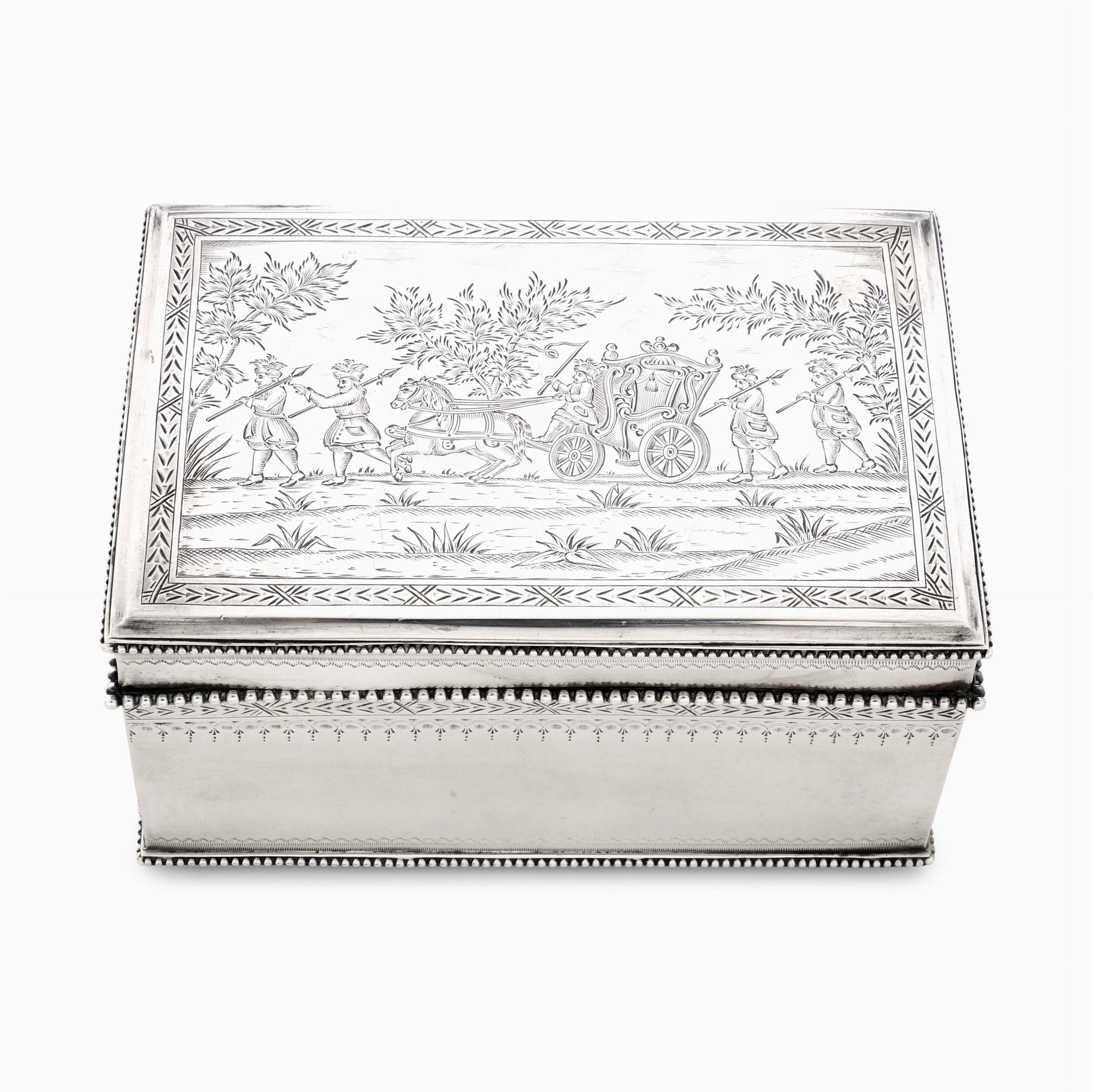 Coperchio finemente cesellato con raffigurazione di viaggio in carrozza