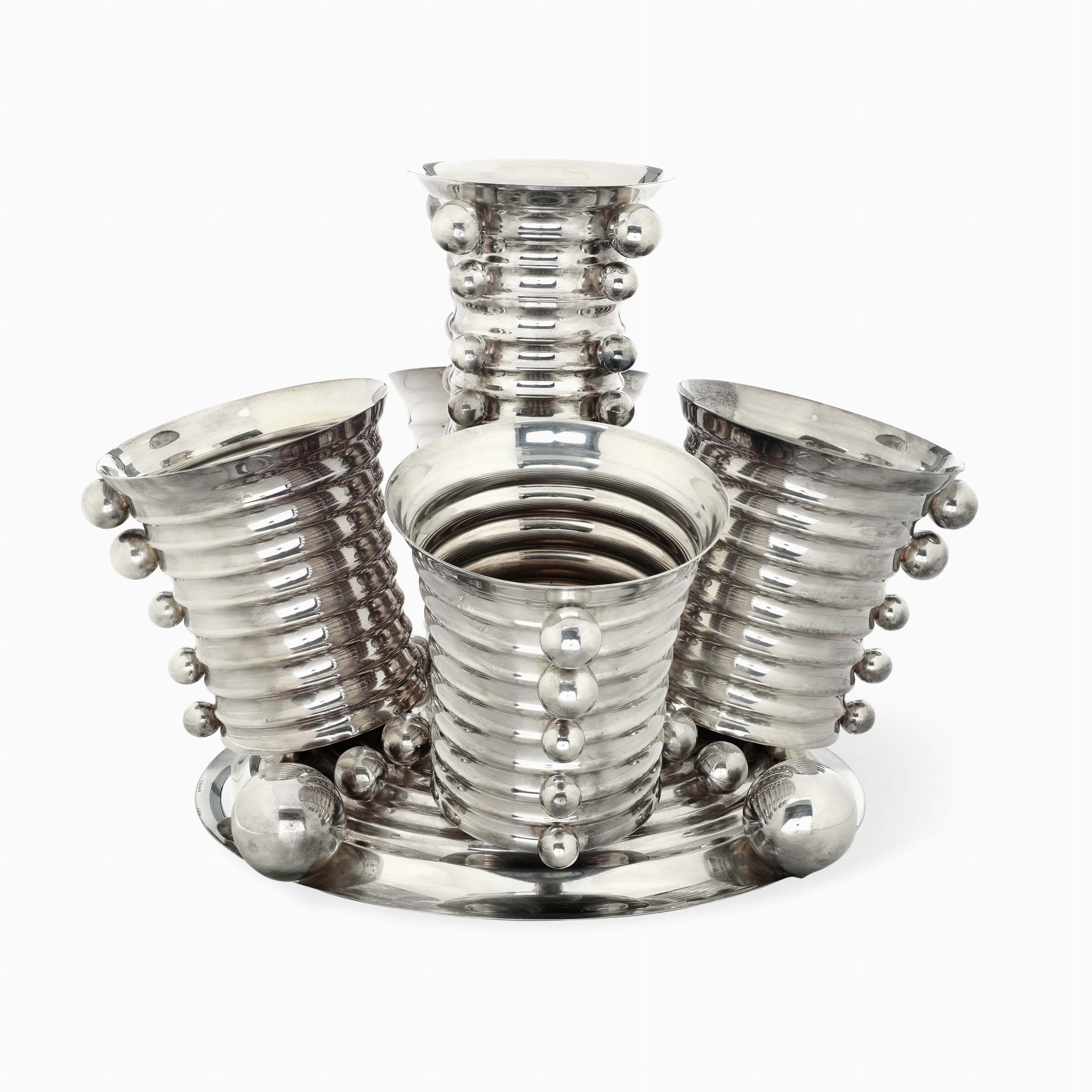 gr 12750Largh. 70 - Prof. 70 - Alt. 48 Cm Elaborato modello Decò con piede circolare gradinato su cui poggiano cinque vasi tronco conici con nervature orizzontali e motivi globulari disposti verticalmente