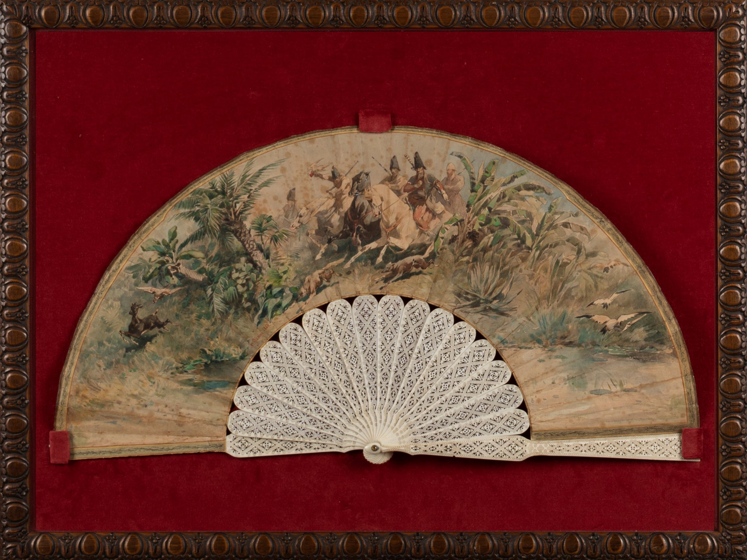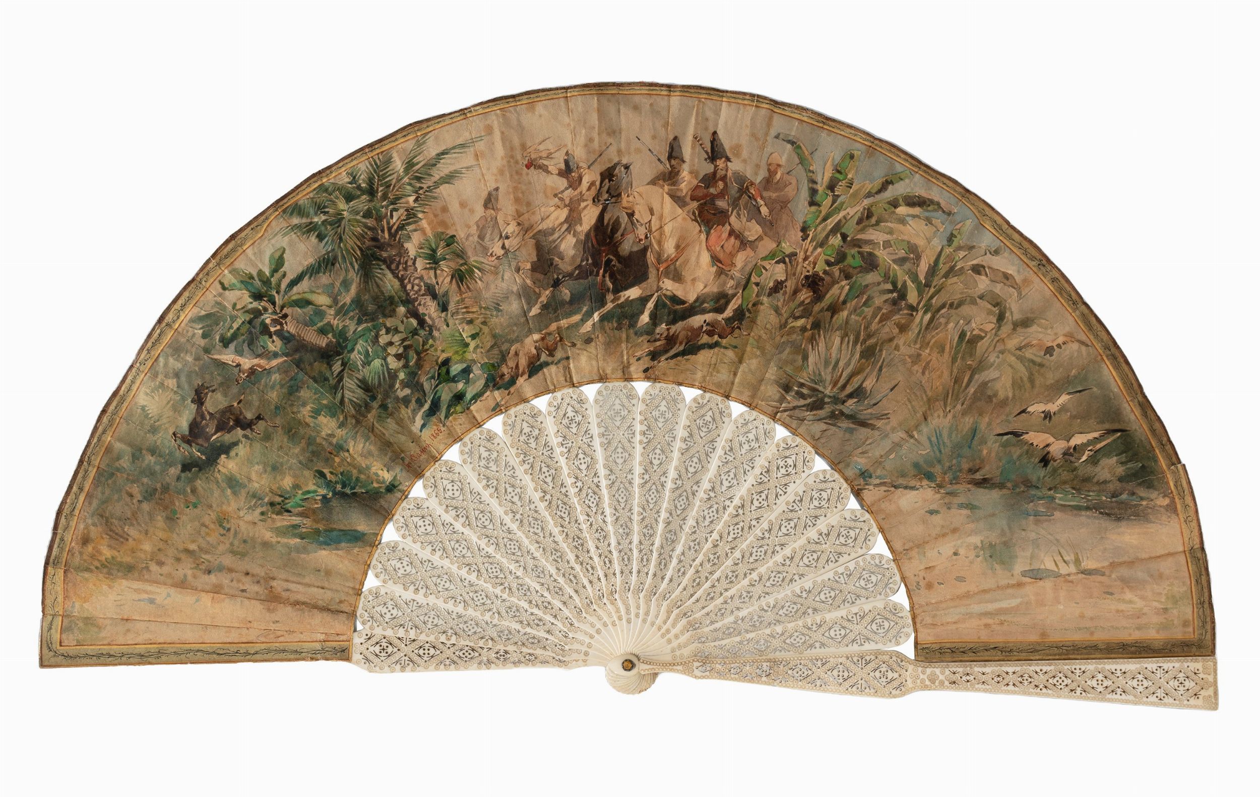 tecnica mista su ventaglio con stecche in osso traforate e incise, cm 26 x 50