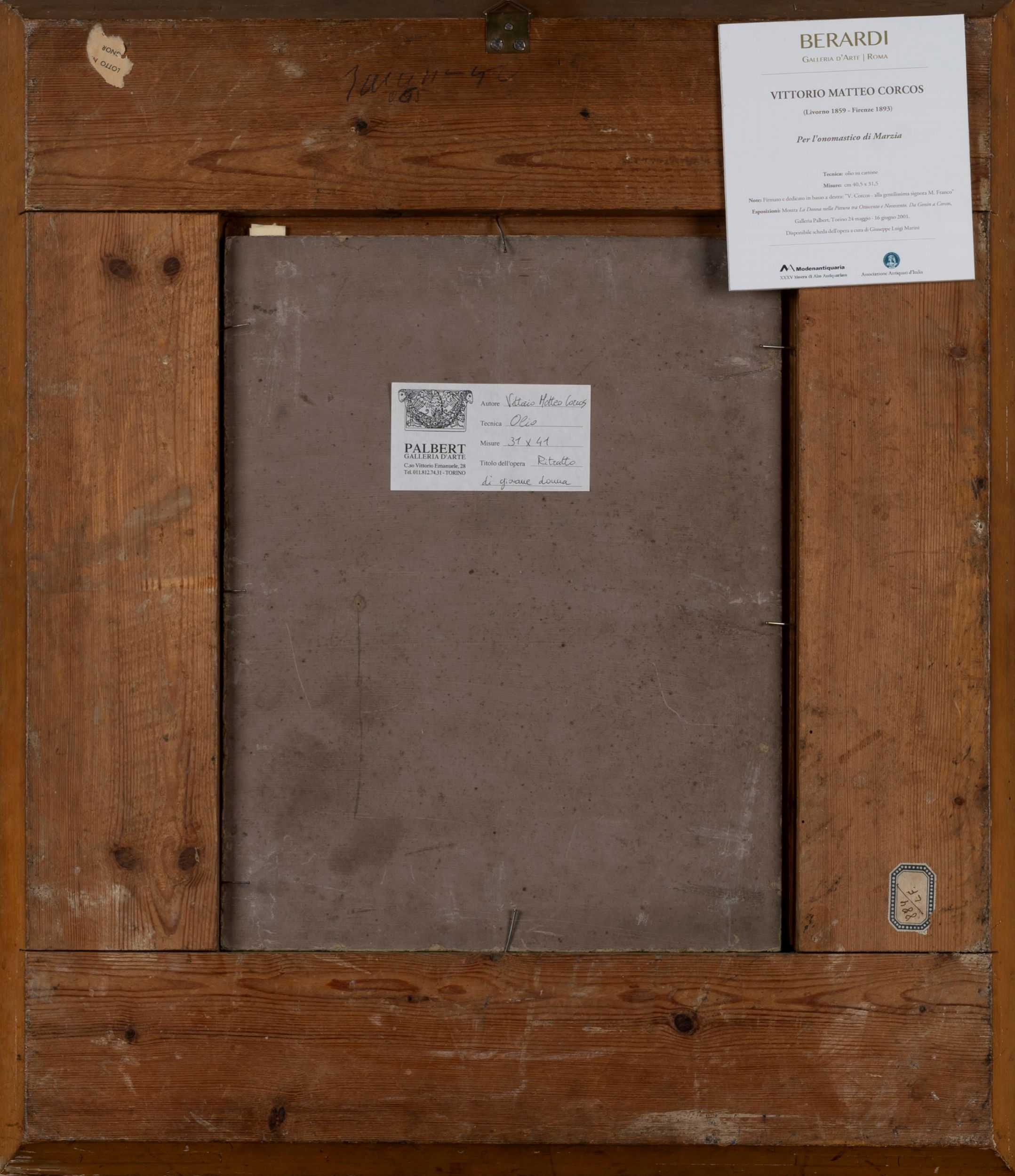 firmato e dedicato in basso a destra: V. Corcos / ALLA GENTILISSIMA SIGNORA / M. FRANCOSul retro, cartellino a stampa della Galleria d'Arte Palbert con riferimenti a penna all'autore e al dipinto.