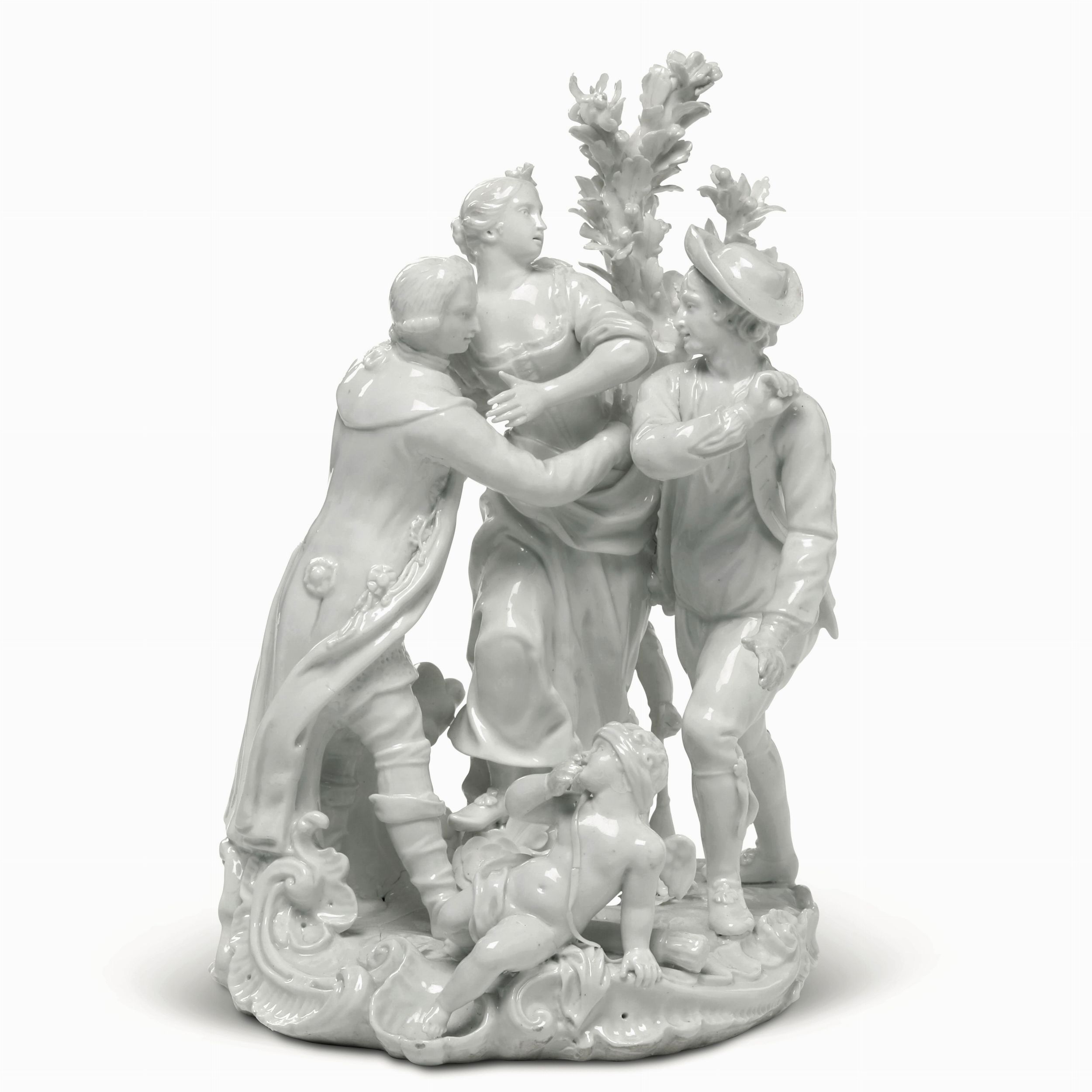 Porcellana bianca. Marca: assente. Altezza cm 20,3. Conservazione: mano sinistra del contadino e mano destra di Amore restaurate, mancanze minori alla vegetazione