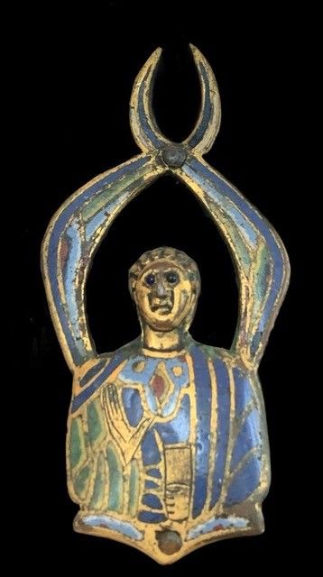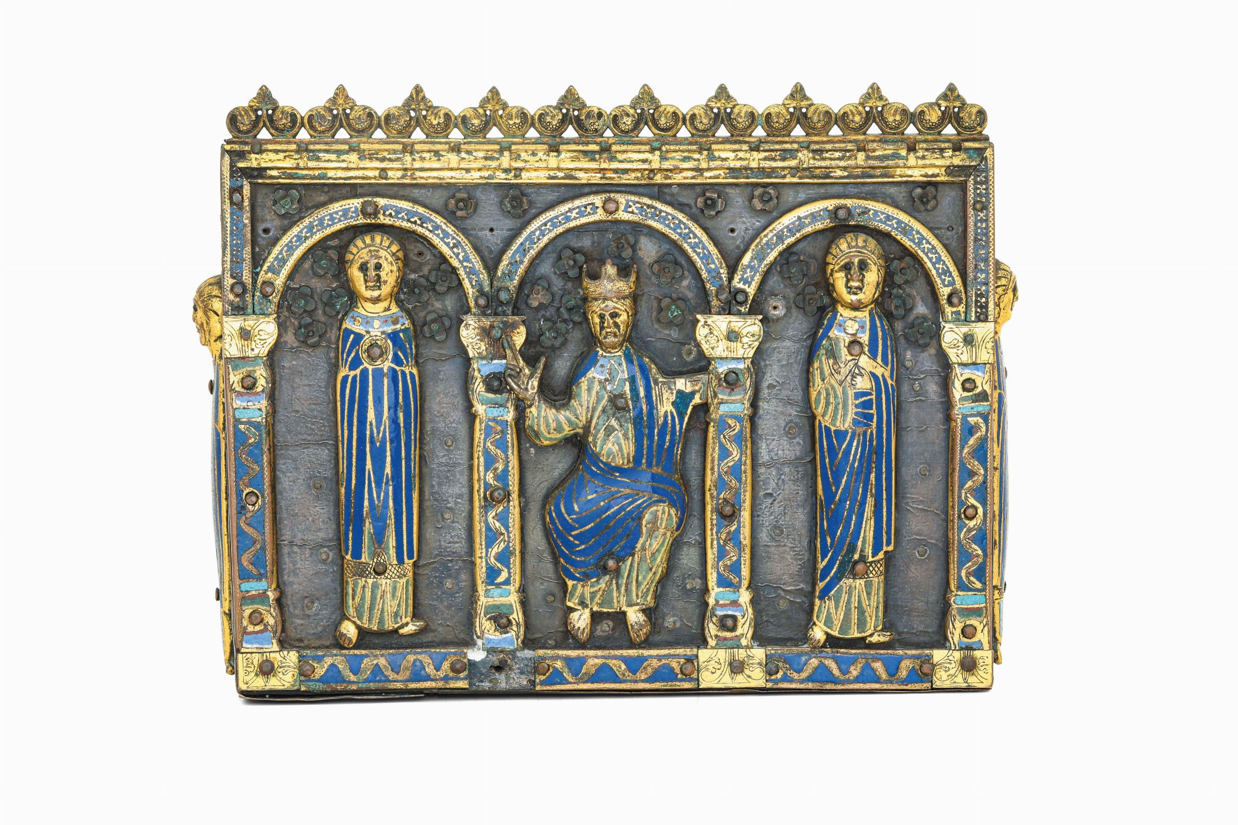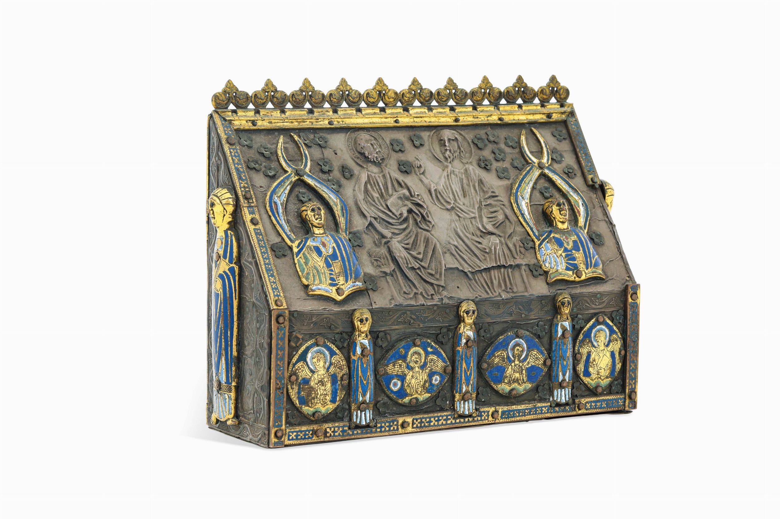 Largh. 23 - Prof. 7 - Alt. 18 Cm Il singolare cofanetto architettonico in legno e metallo sbalzato ispirato ai reliquiari medievali e probabilmente realizzato nel XIX secolo nasce con la funzione di fungere da supporto ad una serie di elementi, figure e placchette in rame sbalzato, dorato e smalto champlevè tipici della produzione orafa limosina del XIII secolo