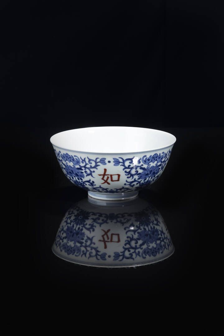Ciotola in porcellana bianco e blu con decori floreali e iscrizioni Cina Repubblica [..]