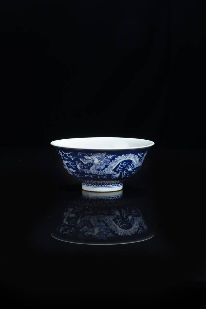 Ciotola in porcellana bianco e blu dipinta con draghi tra le nuvole Cina Repubblica [..]