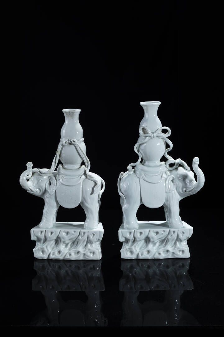 Coppia di elefanti in porcellana blanc de chine sormontati da vaso Cina dinastia [..]