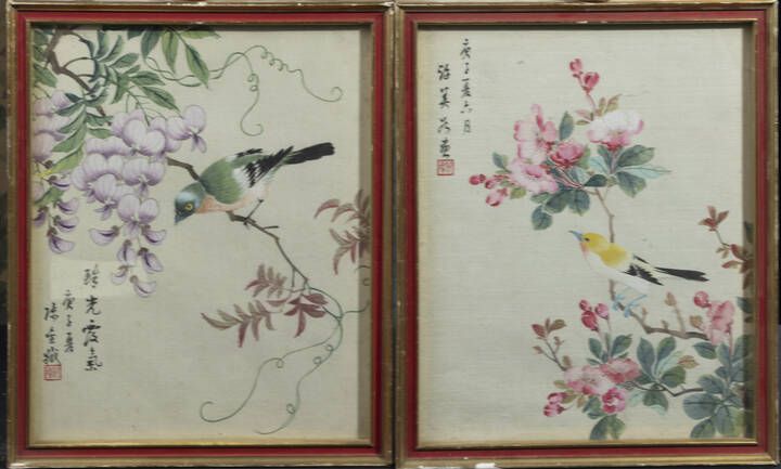 Coppia di quadretti dipinti su pergamena raffiguranti uccelli su rami Cina Repubblica [..]