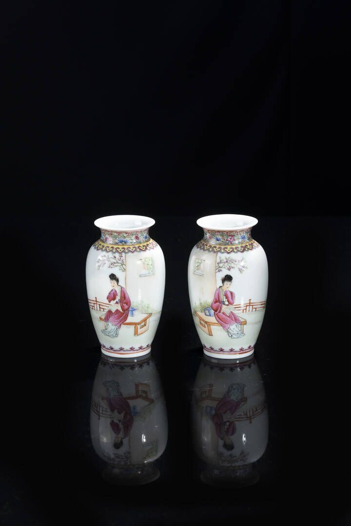 Coppia di vasetti in porcellana Famiglia Rosa dipinti con figure femminili in giardino Cina Repubblica XX sec H cm 12x7