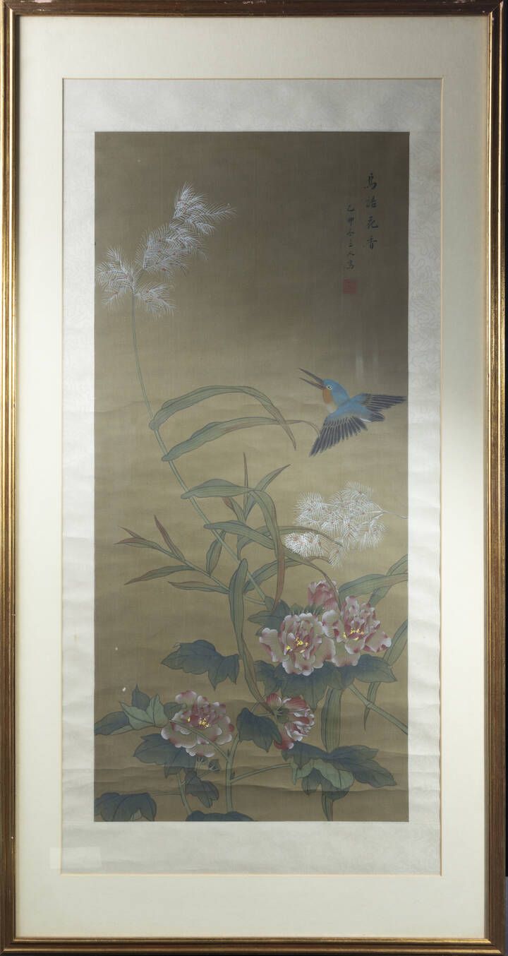 Dipinto su pergamena raffigurante uccello su ramo in fiore con iscrizioni Cina Repubblica XX sec H cm 96x45