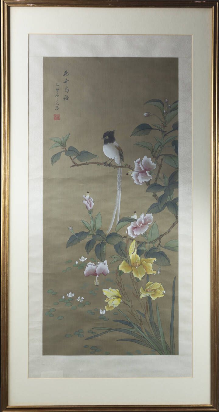 Dipinto su pergamena raffigurante uccello su ramo in fiore con iscrizioni Cina Repubblica XX sec H cm 96x45