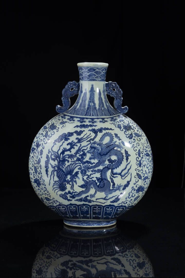 Grande fiasca in porcellana bianco e blu con decori di draghi Cina dinastia Qing XVIII sec H cm 46 Diam cm 35
